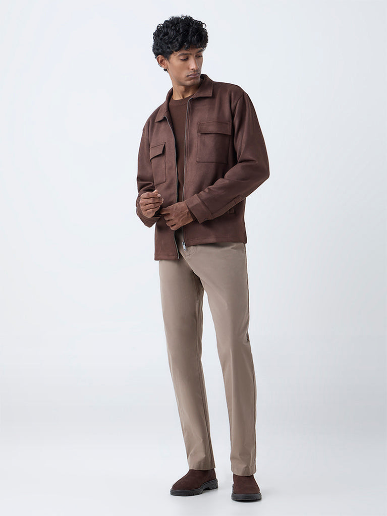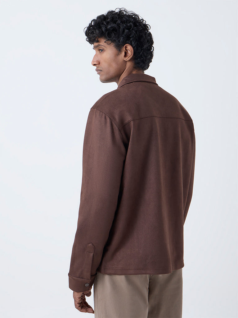 Get your dapper on with this dark brown jacket from Ascot, defined by a smooth suede exterior that gives the silhouette a sophisticated edge. Designed with a spread collar, a zipper front and full sleeves, it is balanced with multiple pockets that add everyday utility. Cut from a premium-blend fabric with a lightweight feel, it stands out as a polished outerwear choice.