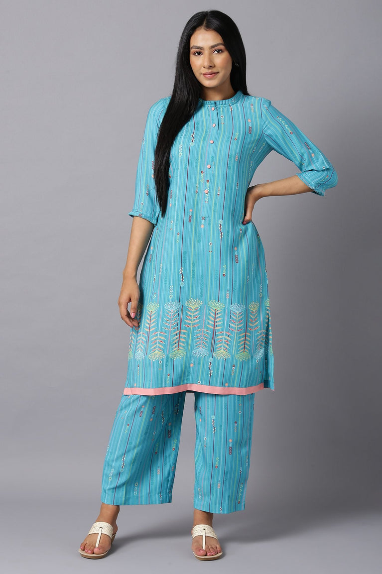 Step Out In Style By Wearing This Pretty Modern Ethnic Set In Blue Colour. The Set Includes Straight Floral Print kurta, Which Has Mandarin Collar With Buttons, And Coordinated With Matching High-Rise Culottes.