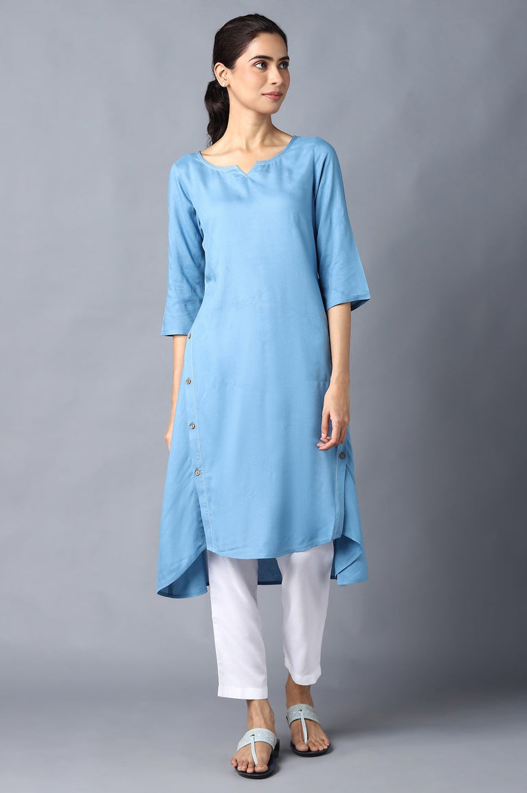 Update Your Daily Wear Wardrobe With This Trendy kurta Set. The Set Includes High-Low Solid kurta In A-Line Silhouette And Comes In Round-Neck With V. It Is Coordinated With White Straight Trouser Pants.