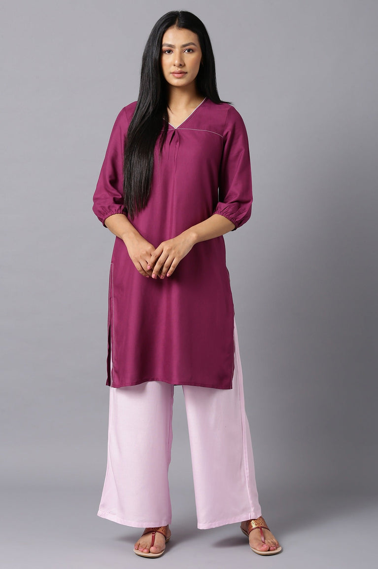 Get Styled For The Friday Office Look In This Statement Modern kurta Set. The Set Includes Solid Purple Straight kurta In V-Neck. It Is Coordinated With Light Pink Straight Palazzo.