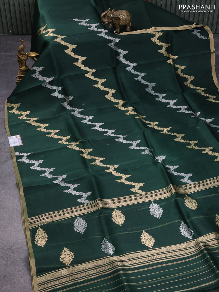 Banarasi organza silk saree bottle green with silver & gold zari weaves and zari woven piping border