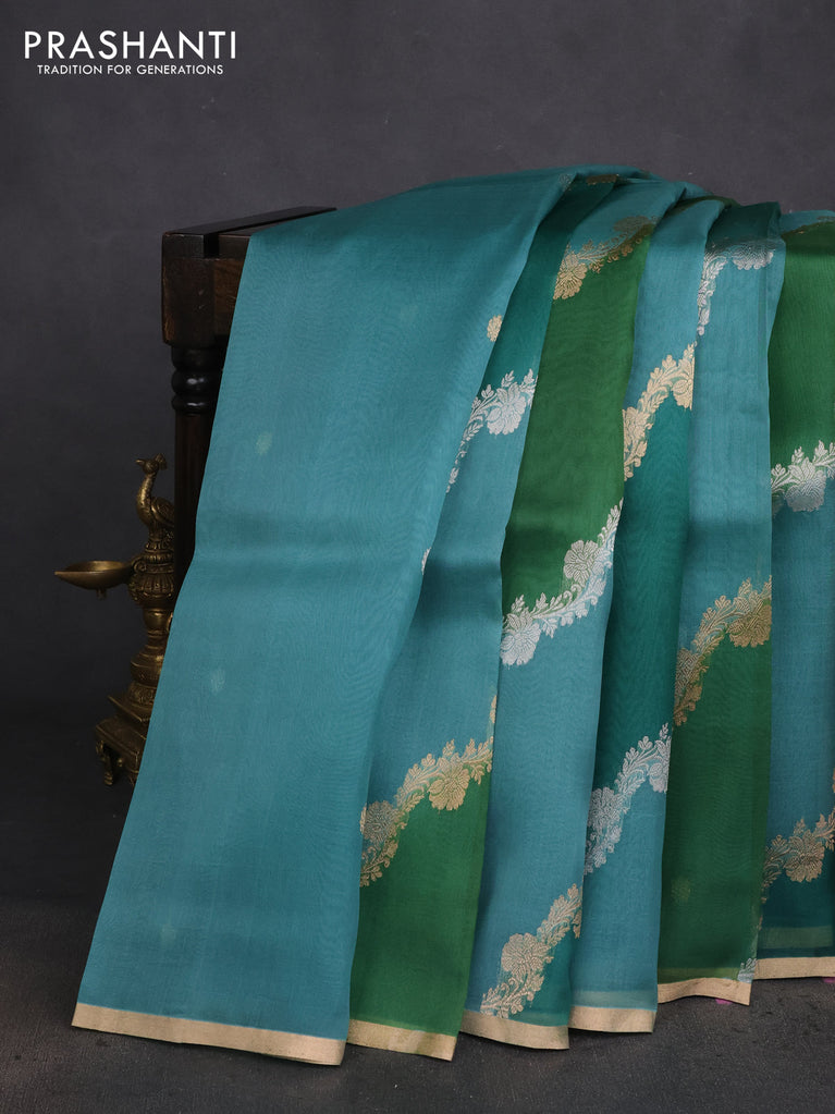 Banarasi organza silk saree teal green shade with silver & gold zari weaves and zari woven piping boder
