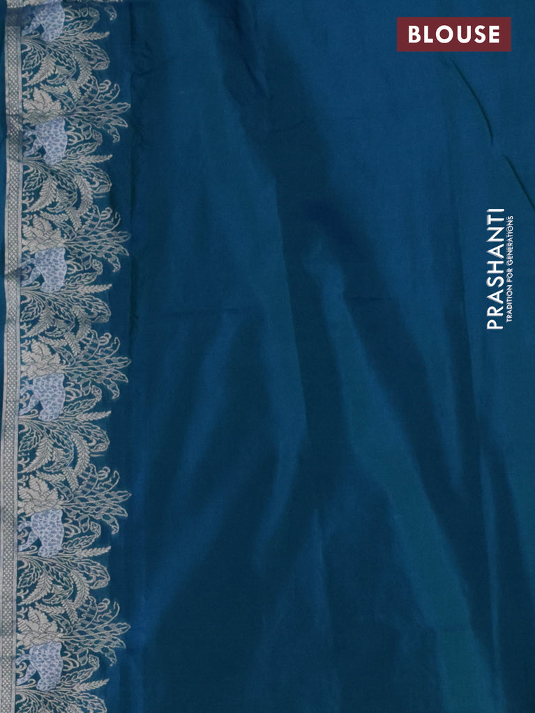 Banarasi semi katan silk saree dual shade of teal bluish green with allover silver & gold zari weaves and deer design zari woven border