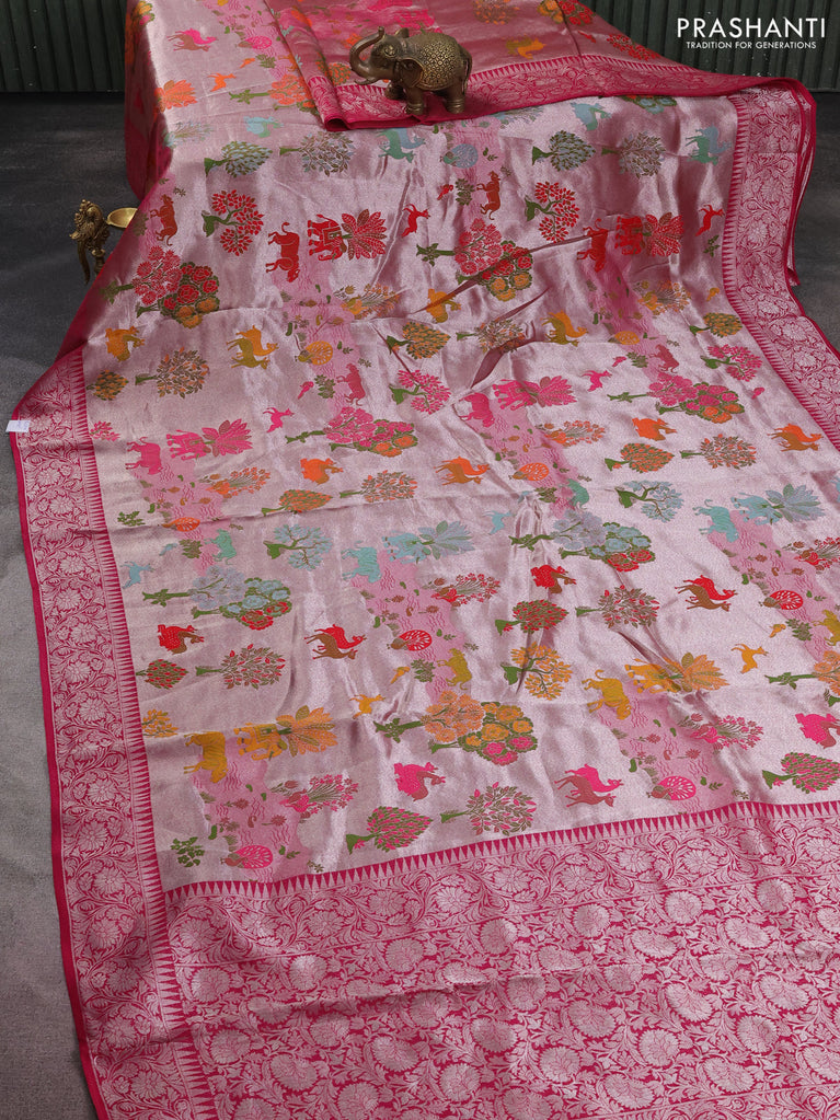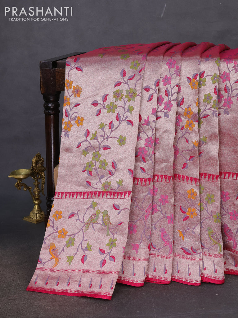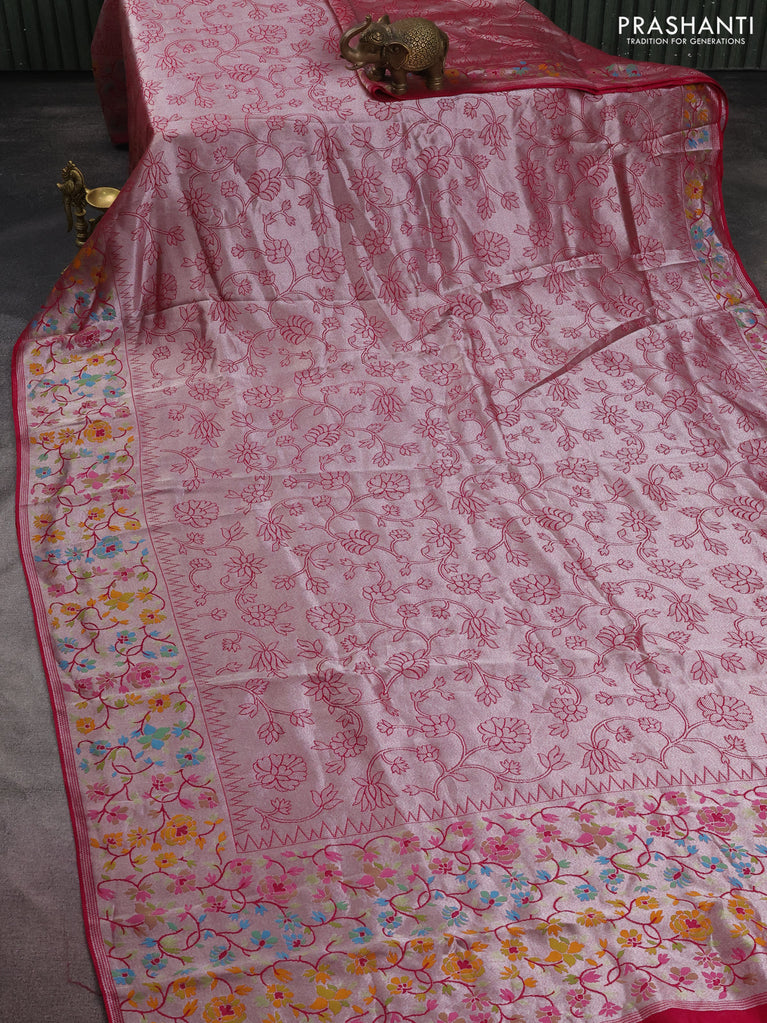 Banarasi semi raw silk saree pink with allover silver zari woven floral weaves and floral design paithani border