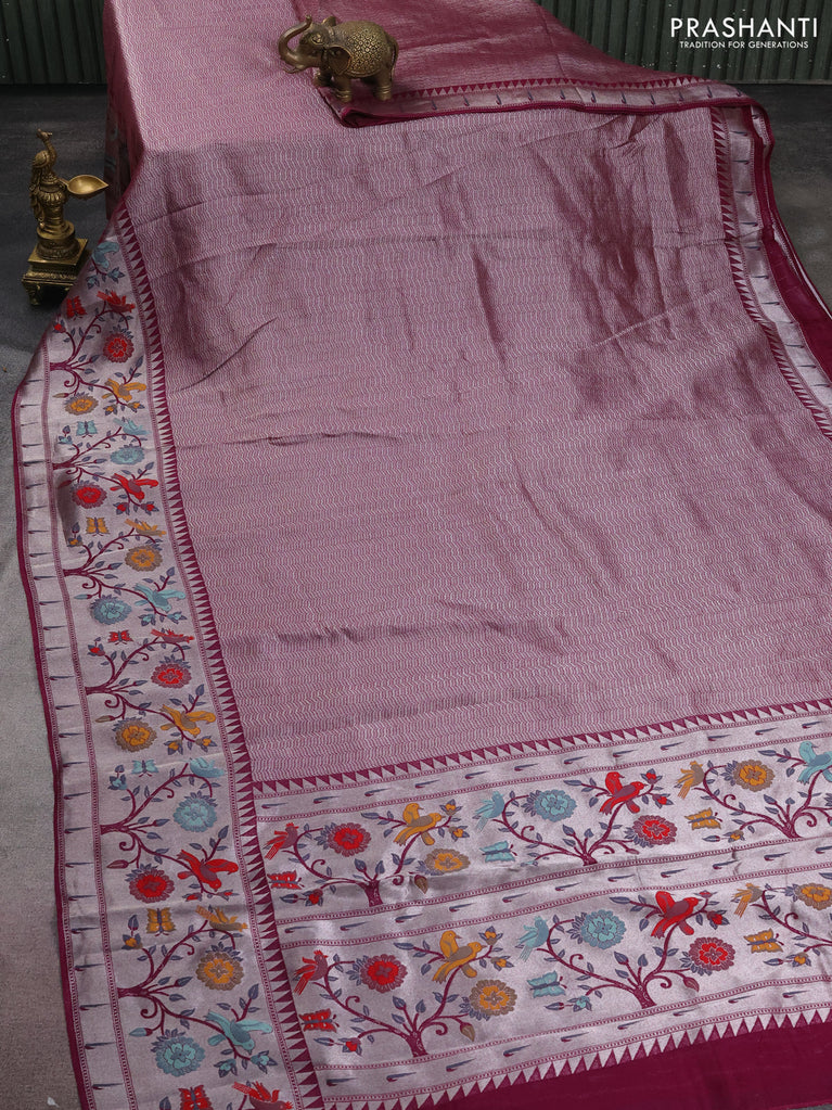 Banarasi semi raw silk saree violet with allover silver zari woven paithani weaves and silver zari woven border