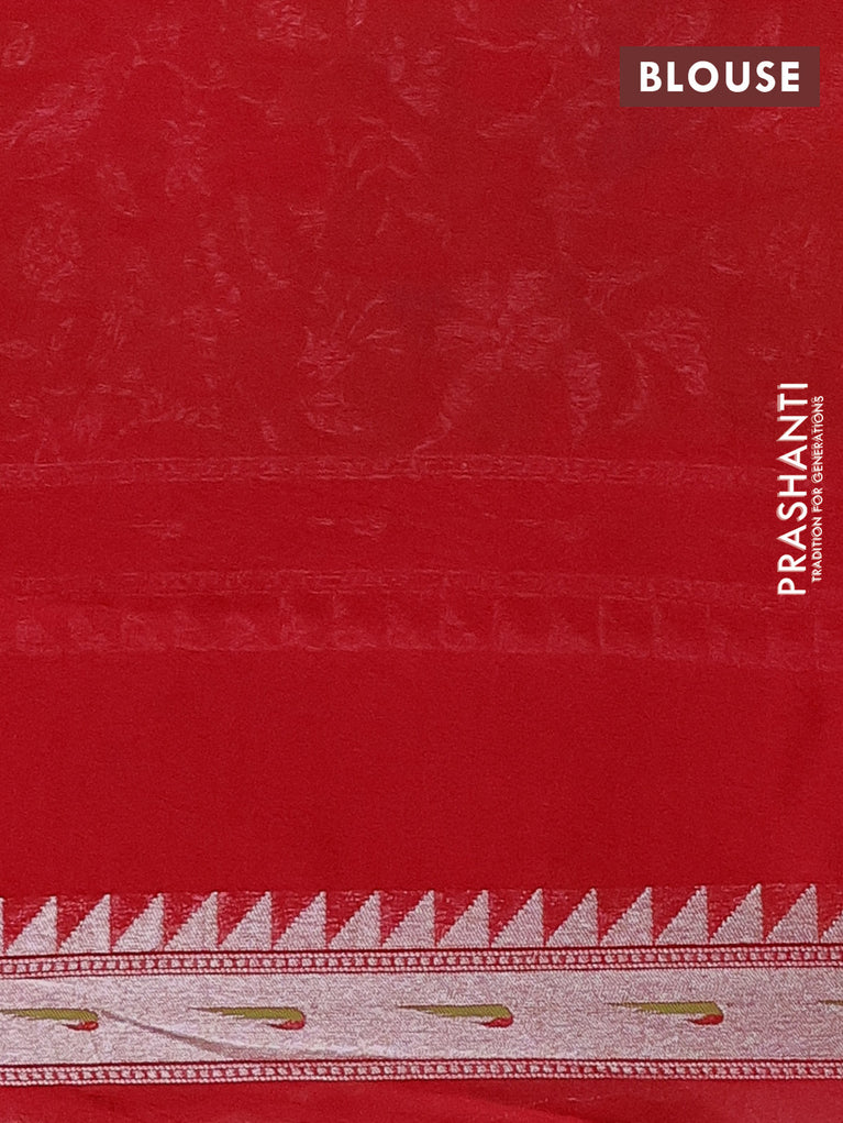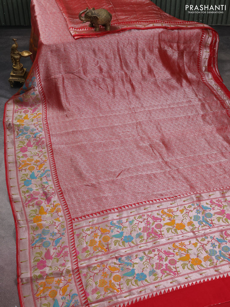 Banarasi semi raw silk saree red with allover silver zari woven brocade weaves and floral design paithani border