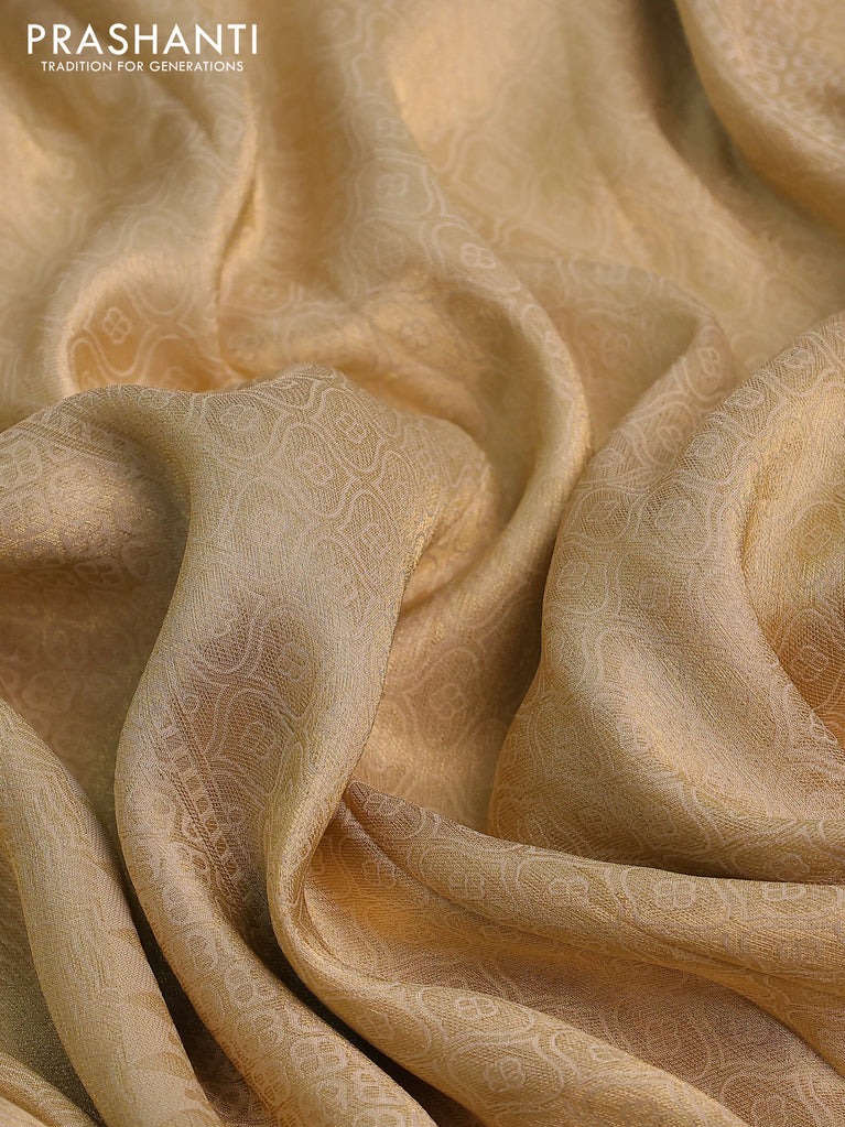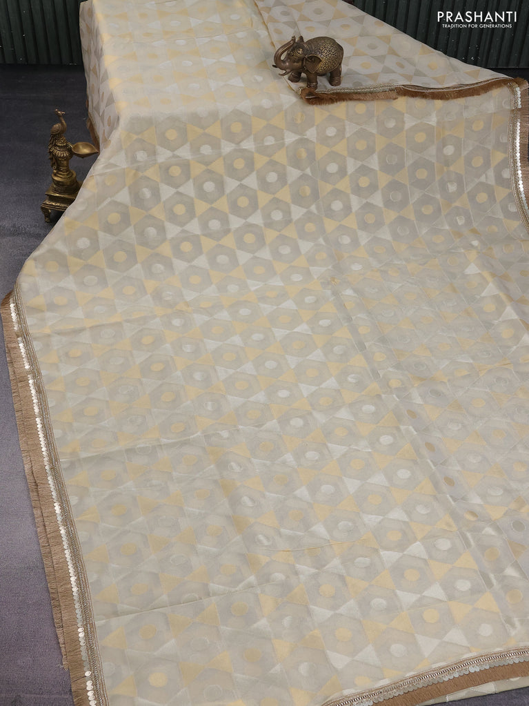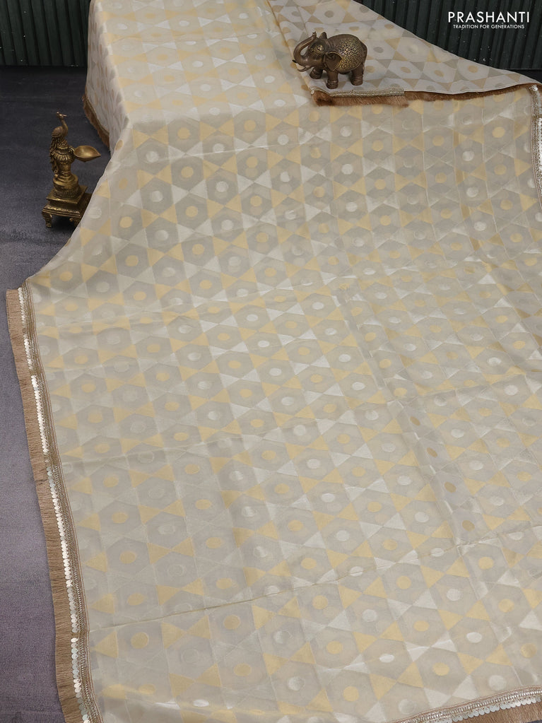 Banarasi tissue saree beige and mustard yellow with allover zari woven geometric wevaes and lace work border