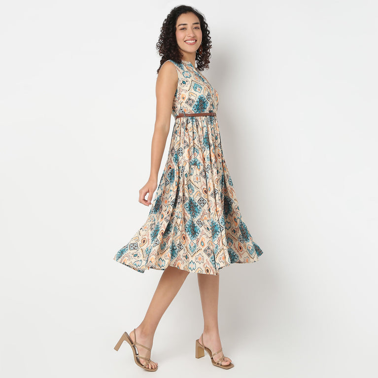 Below Knee Sleeveless Flare Fit Printed Kurta