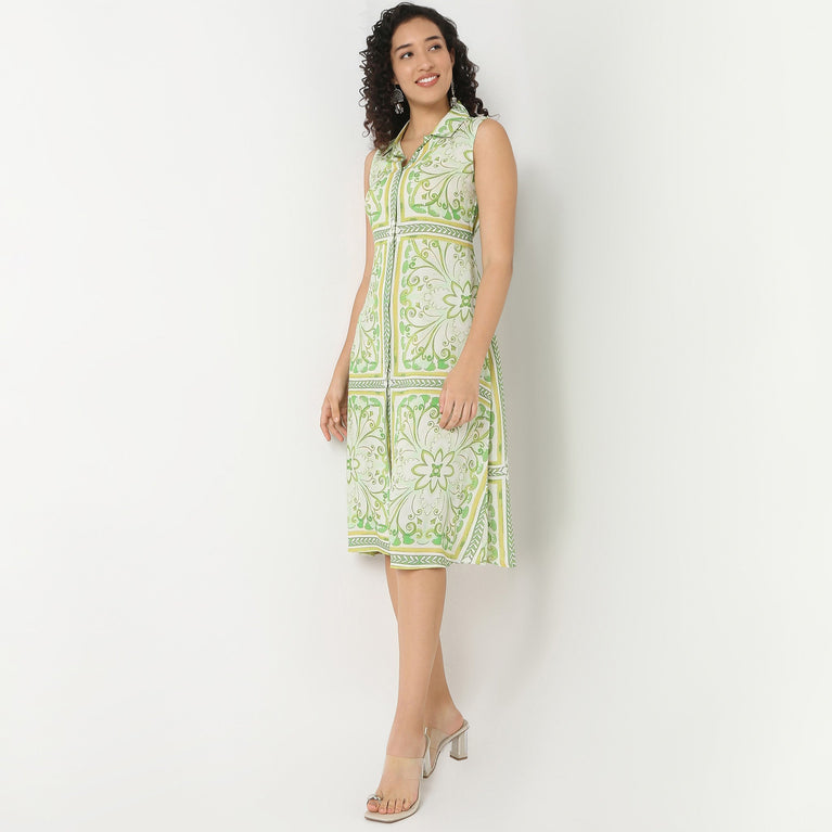 Below Knee Sleeveless Shirt Collar Schiffli Flare Fit Dress