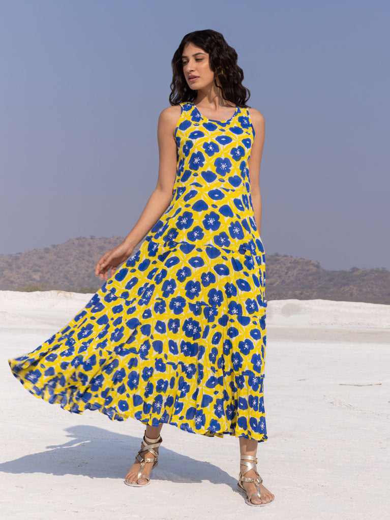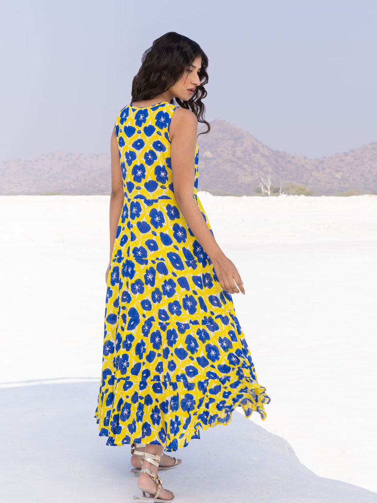 Below Knee Sleeveless Flare Fit Printed Kurta