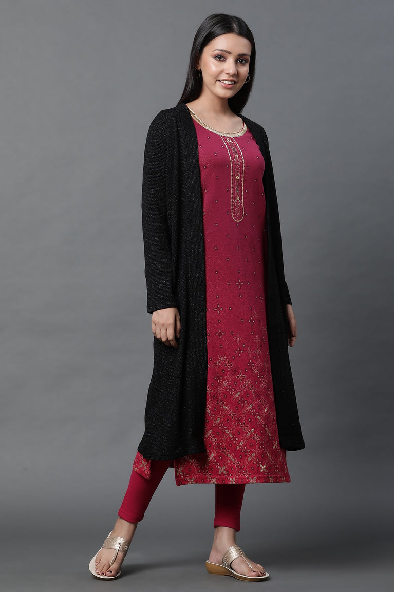 Made With Premium Soft Touch Acrylic, This Knit Cardigan Has Open Front And Features Floral Print On Border For Contrasting Details. It Has Printed Full Sleeves And Long Length, Which Gives A Chic Look.