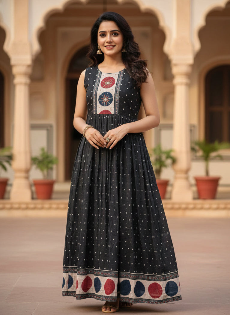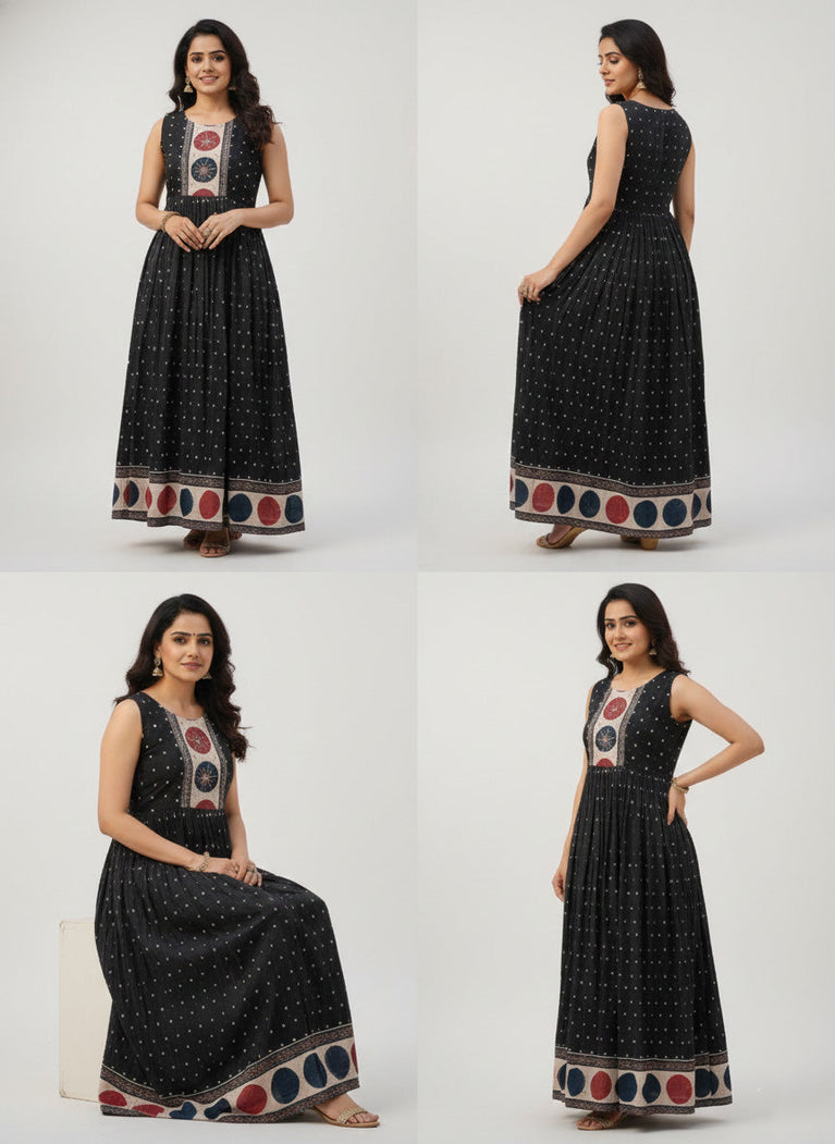 Embrace timeless elegance with this stunning black georgette printed long dress. Crafted from lightweight, breathable georgette fabric, this piece drapes beautifully and moves with grace. The intricate printed design adds visual interest while the classic black base ensures versatility for any occasion. Perfect for festive celebrations, evening gatherings, or sophisticated everyday wear, this dress combines comfort with refined style. The flowing silhouette flatters all body types, making it an essential addition to your wardrobe.