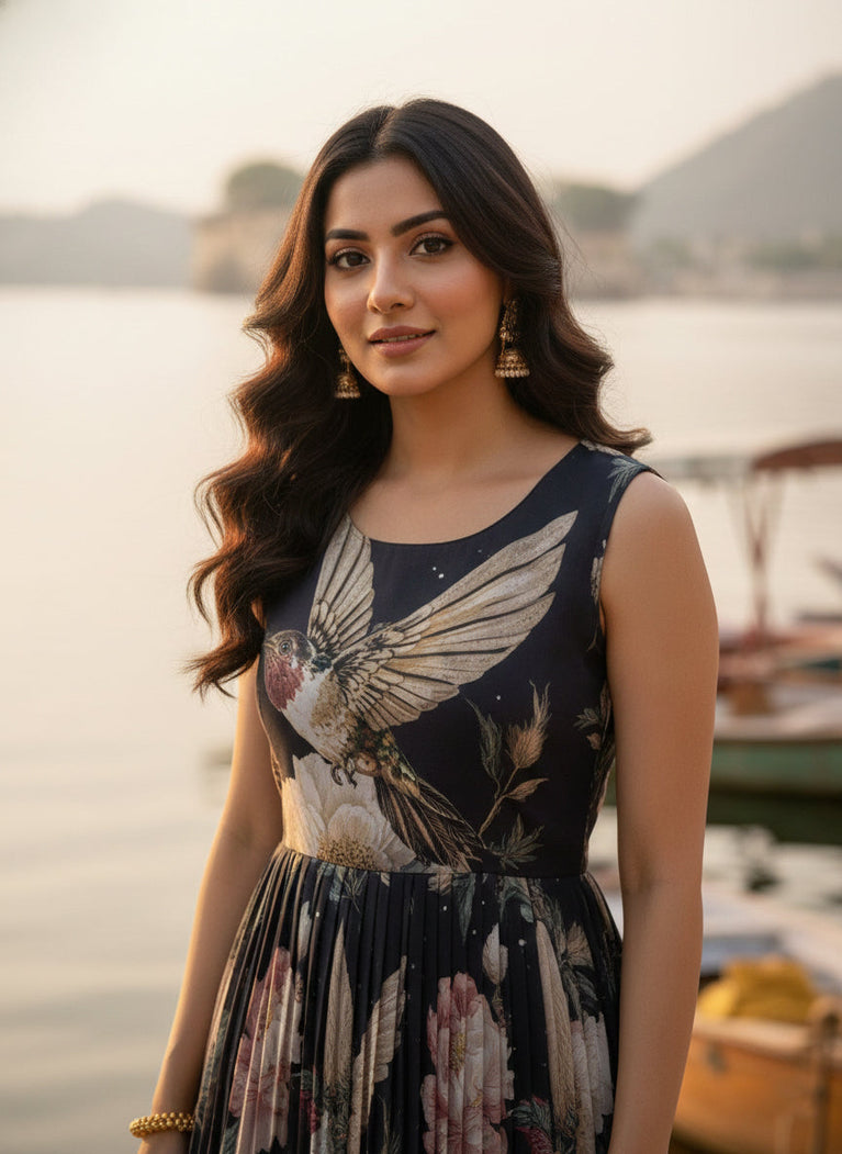 Embrace timeless elegance with this stunning black georgette long dress, featuring an exquisite floral digital print that brings sophistication to any occasion. The lightweight georgette fabric drapes beautifully, offering comfort and graceful movement throughout the day. Perfect for weddings, festive celebrations, or evening gatherings, this versatile piece transitions seamlessly from day to night. The intricate floral design adds a touch of femininity and charm, while the classic black base ensures it pairs effortlessly with your favorite accessories. A wardrobe essential that celebrates both style and comfort.