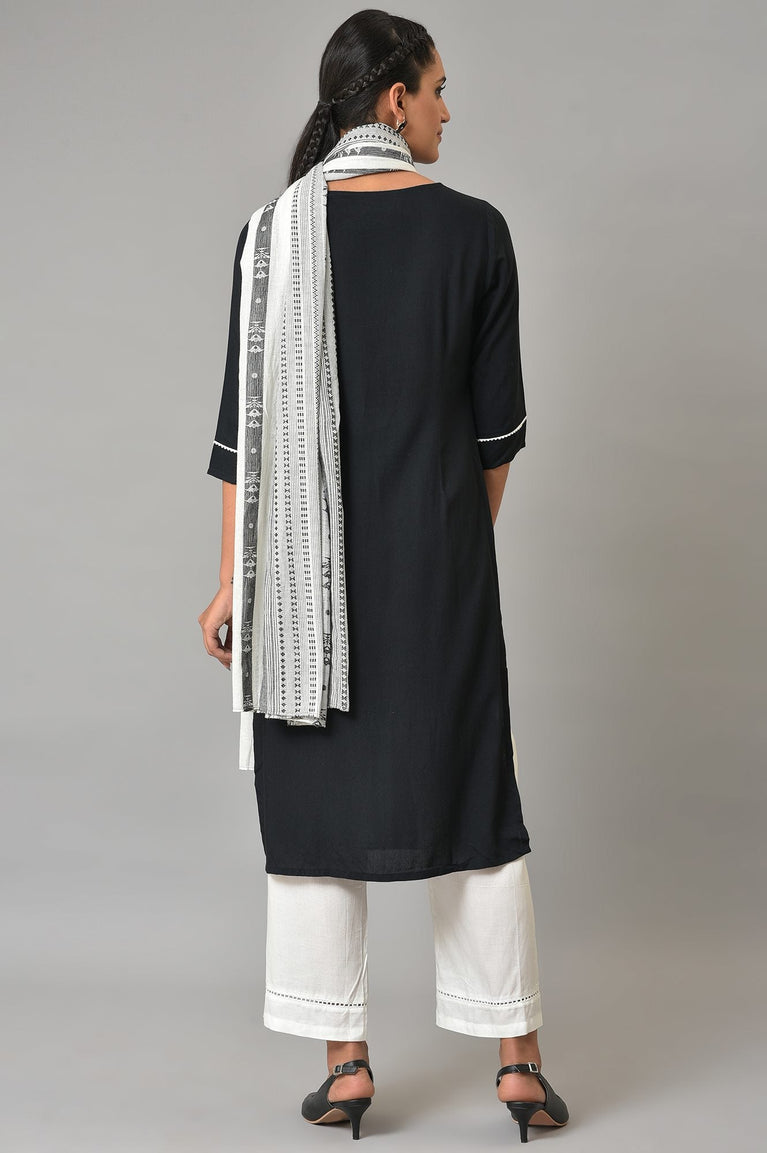 Black Geometric Printed Hand Work Jacquard Straight Kurta, Palazzo and Dupatta Set