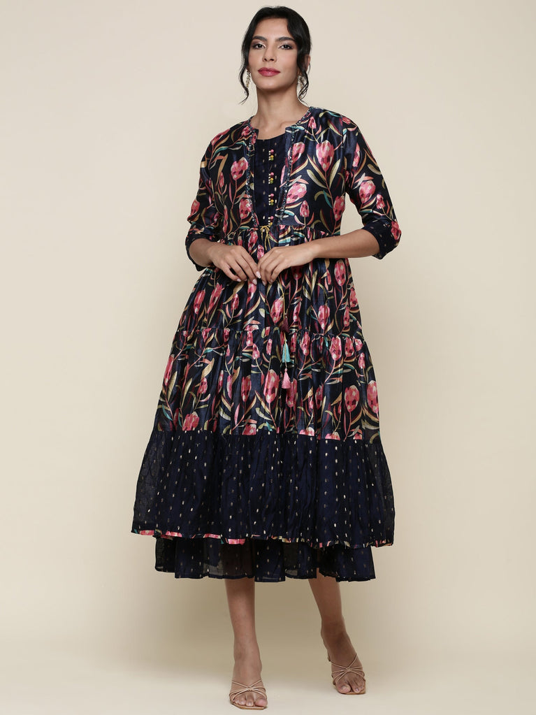 A Beautiful Multi-Colored Hand Block Print A-Line Kurta, Featuring Delicate Mirror Work And Kantha Embroidery At Neck And Sleeves Along With Multiple Loops And Mirror Buttosn Opening At Front.
