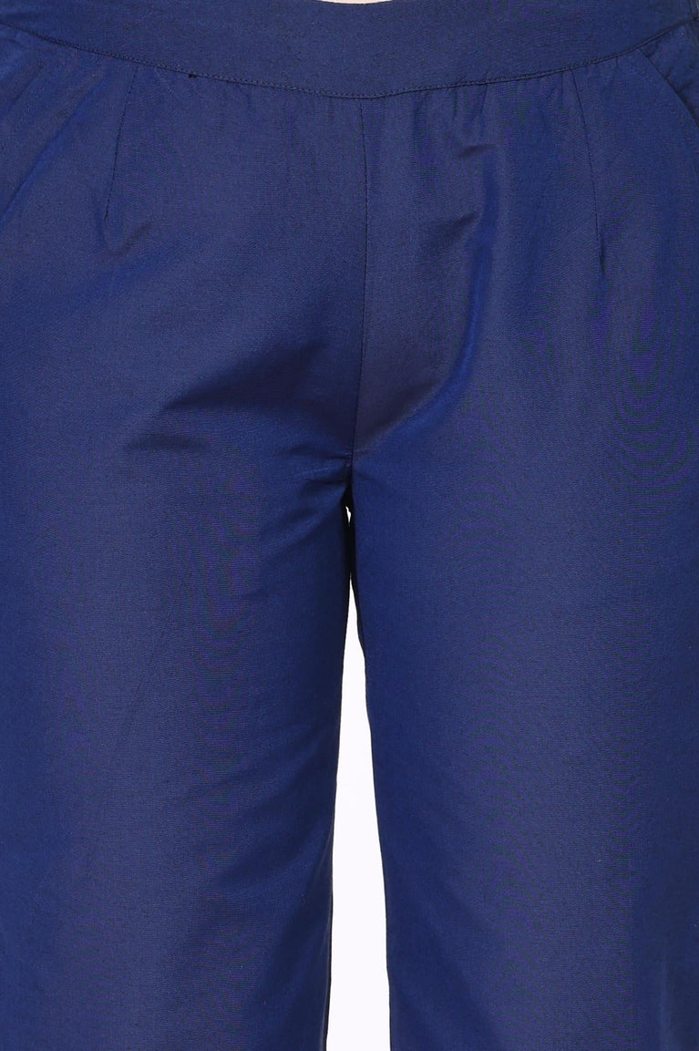 Experience the perfect blend of comfort and style with these blue casual trousers. Crafted from 100% cotton, these ankle-length trousers feature a mid-rise and partially elasticated waistband for a secure fit. The solid pattern and straight hem add a chic touch, while the two front pockets offer practicality. Ideal for a relaxed yet polished look, pair these trousers with a kurta and flats for effortless elegance.