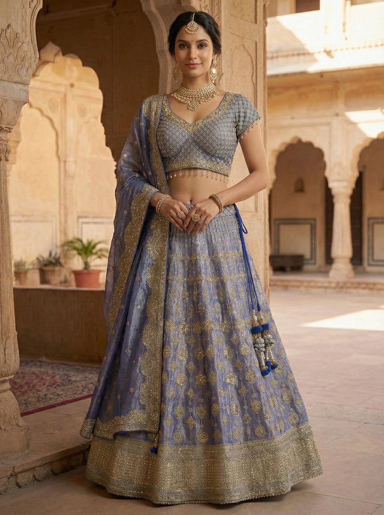 Elevate your ethnic wardrobe with this exquisite blue tissue ghagra set, meticulously crafted with intricate hand embroidery. The lightweight tissue fabric drapes beautifully, offering comfort without compromising on elegance. Each piece showcases detailed embroidery work that reflects traditional artisanal craftsmanship. Perfect for weddings, festivals, and special occasions, this set combines timeless design with contemporary appeal. The rich blue hue complements various skin tones, while the hand-embroidered details add a distinctive touch that sets it apart from mass-produced alternatives. An investment in quality ethnic fashion that celebrates heritage and artistry.
