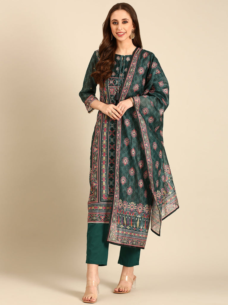 Experience elegance with this Bottle Green Suit Set featuring exquisite all-over organza fabric. Detailed with a delicate neck kardhana and subtle moti work, it blends traditional charm with modern grace. The accompanying organza dupatta adds a sheer, sophisticated layer, perfect for festive occasions or special events. Elevate your wardrobe with this stunning ensemble that promises both comfort and timeless style.