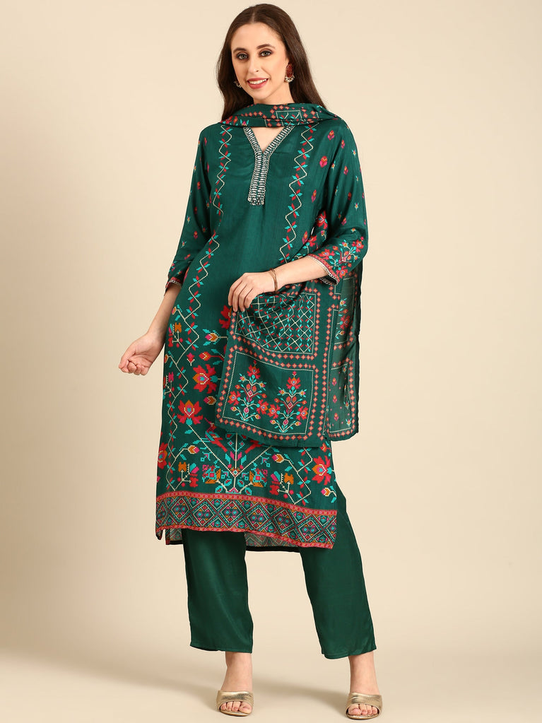 Experience elegance with this Bottle Green Suit Set crafted from soft muslin fabric featuring a delicate computer-printed design. The flattering V-neck is enhanced with intricate gotta patti lace, adding a touch of traditional charm. Paired with a lightweight organza dupatta, this ensemble promises comfort and style for any occasion. Elevate your wardrobe with this blend of classic craftsmanship and contemporary appeal.