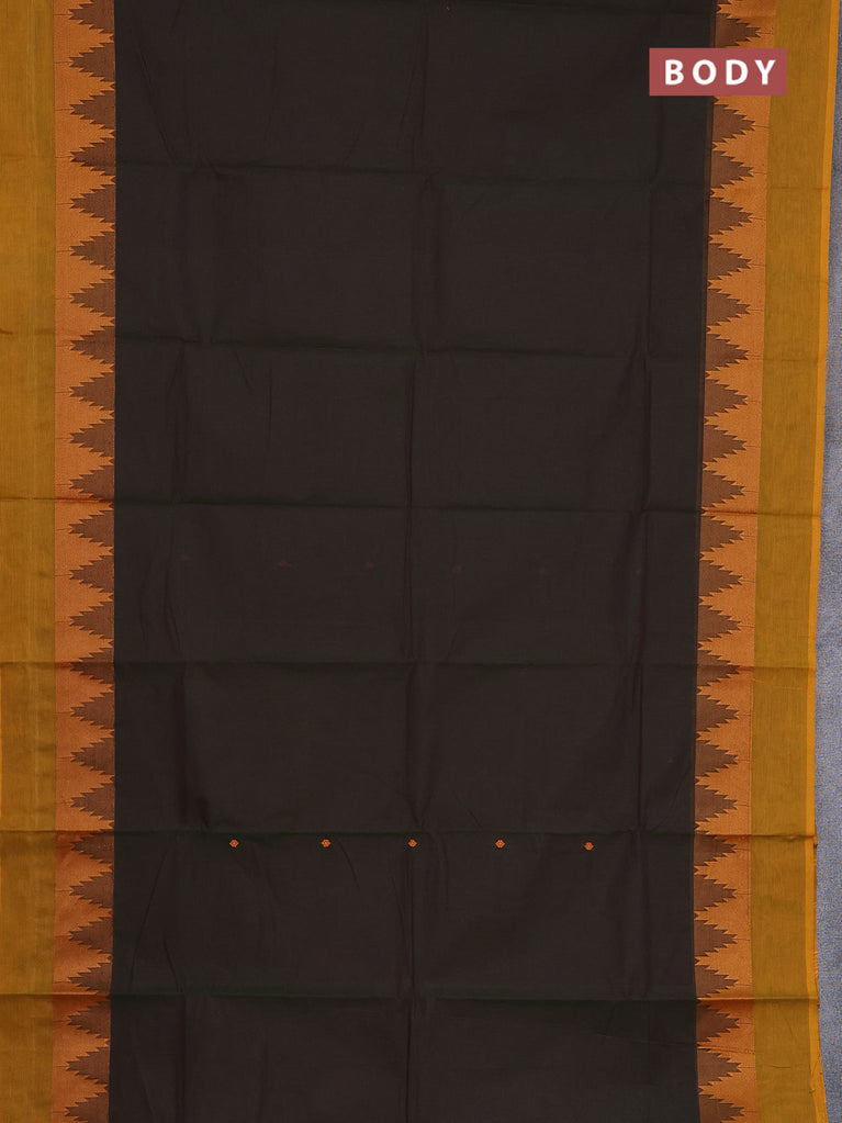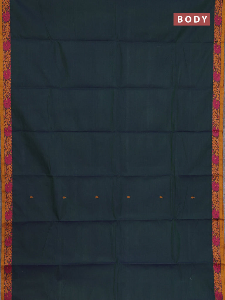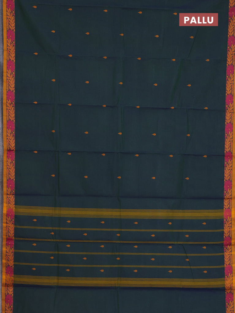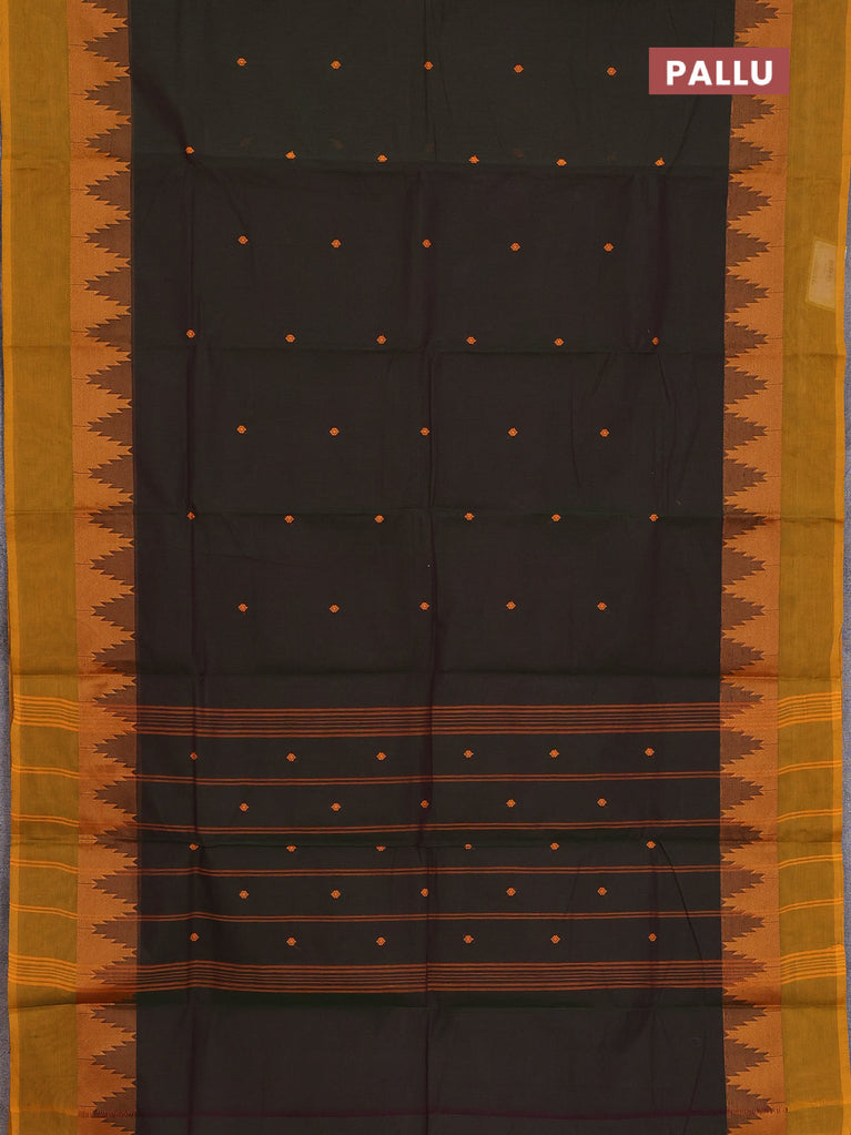 Chettinad cotton saree dark sap green and dark mustard with thread woven buttas and temple thread woven simple border