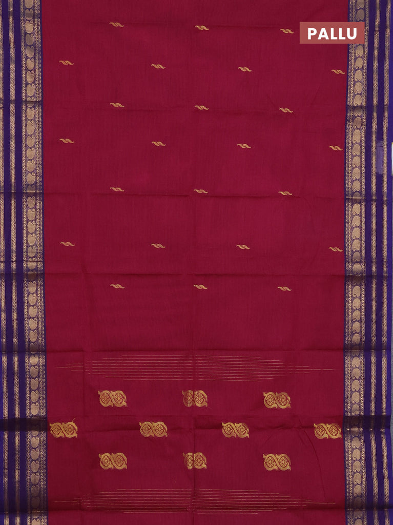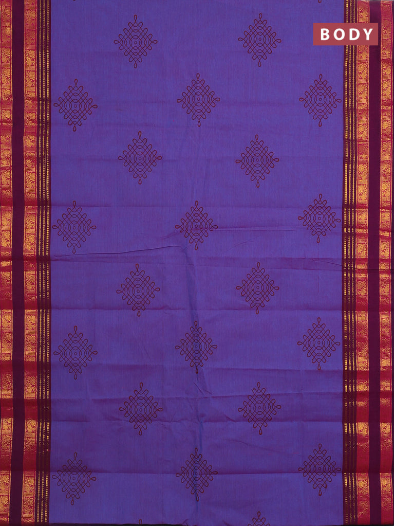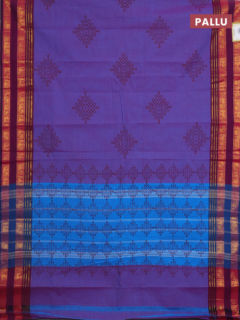 Chettinad cotton saree dual shade of blue and dark magenta pink with rangoli butta prints and rettapet zari woven border