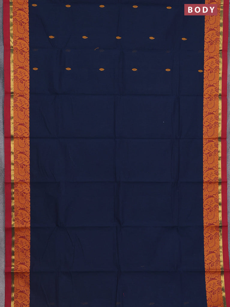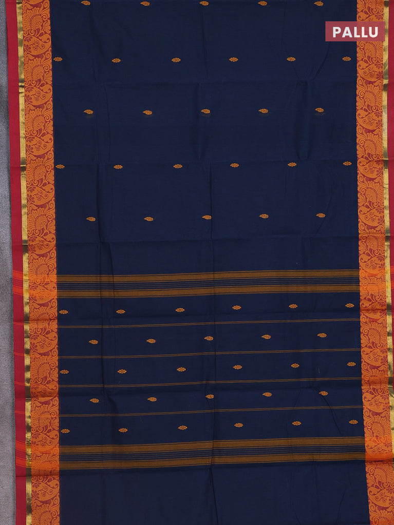Chettinad cotton saree dark blue and cs blue with thread woven buttas and rettapet zari checked border