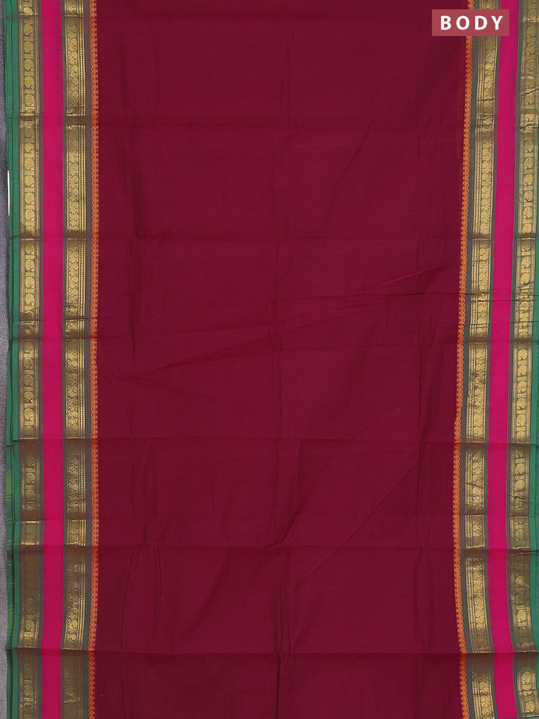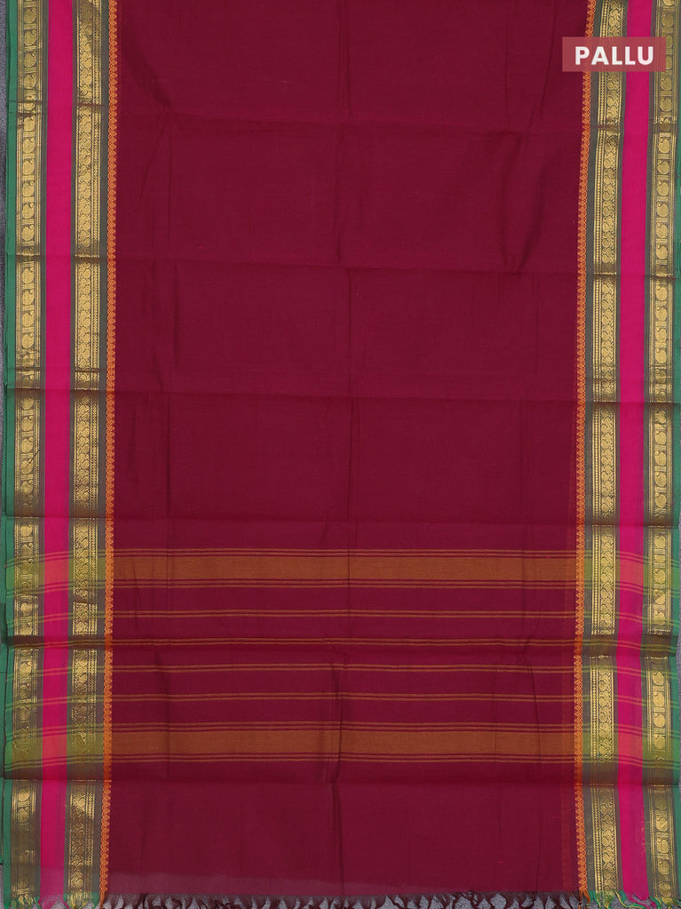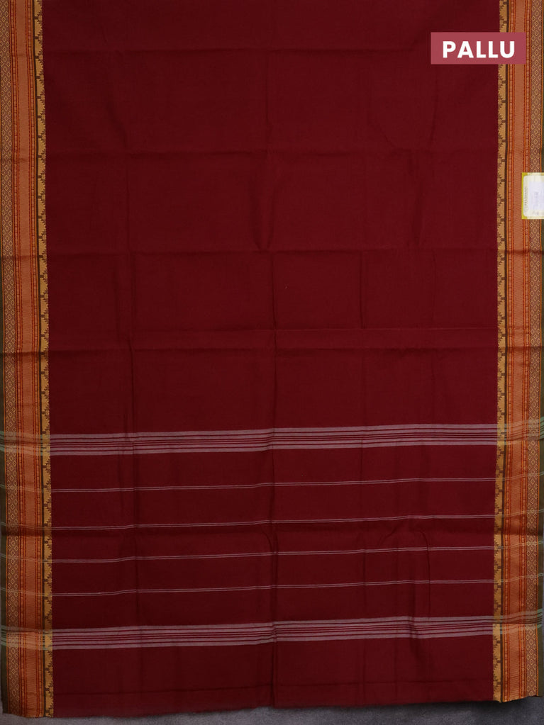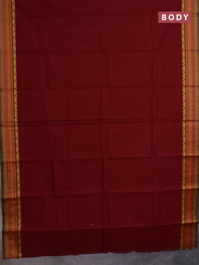 Chettinad cotton saree deep maroon and green with plain body and thread woven border