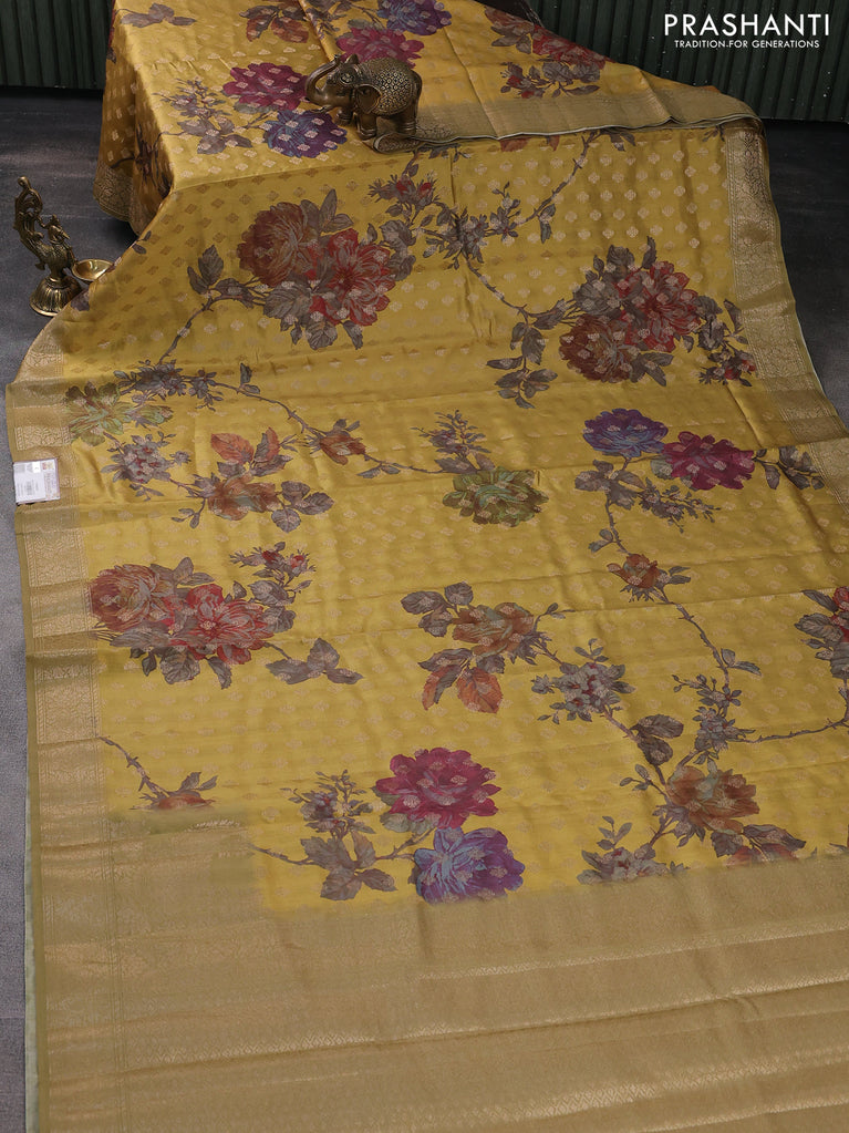 Chiniya silk saree mustard yellow with zari woven buttas & digital prints and zari woven border
