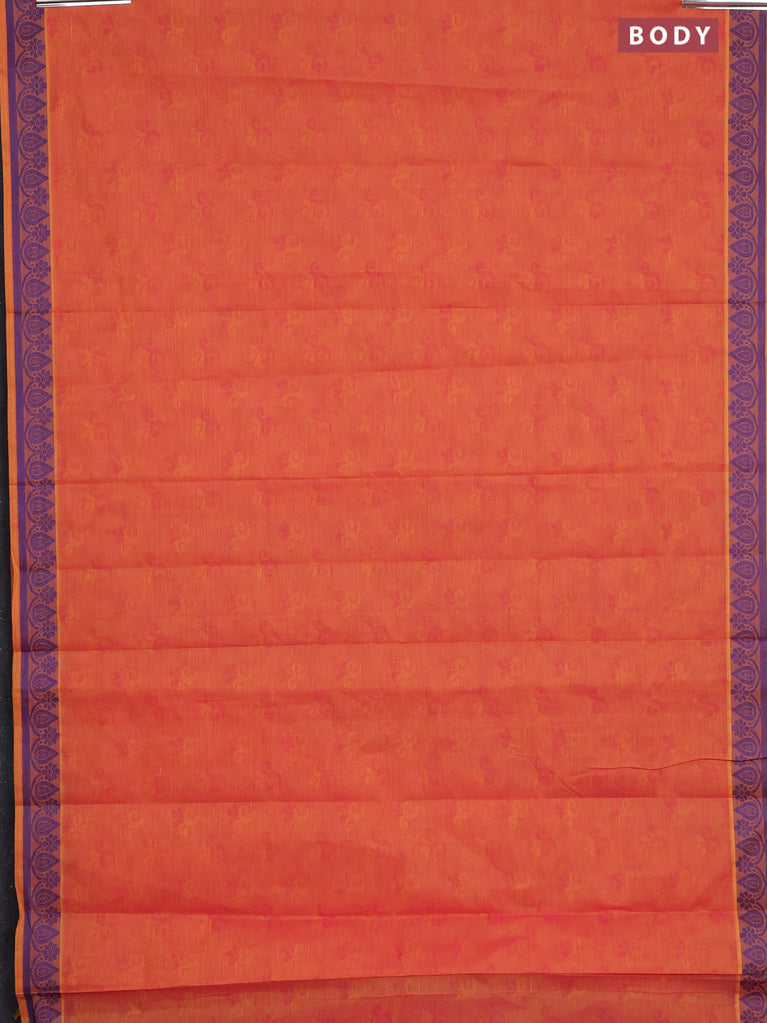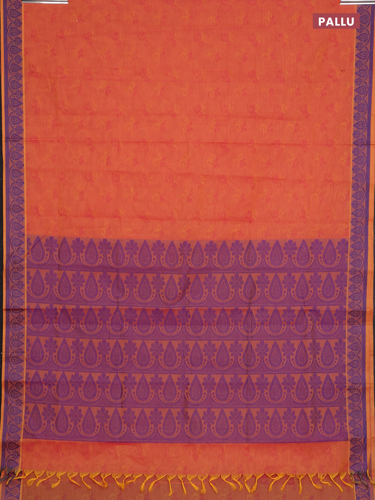 Coimbatore cotton saree dual shade of sunset orange and blue with allover self emboss and thread woven border