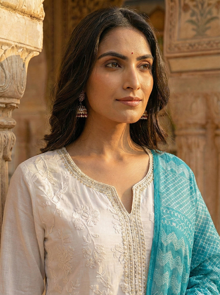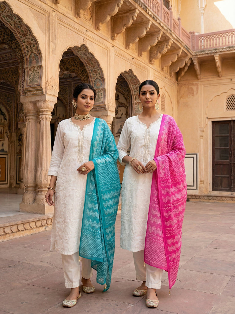 Elevate your ethnic wardrobe with this exquisite cream silk three-piece ensemble, meticulously crafted with intricate hand embroidery. Each piece showcases traditional artistry combined with luxurious silk fabric, offering unparalleled comfort and sophistication. Perfect for weddings, festivals, and special occasions, this set brings timeless elegance to your collection. The delicate embroidery work adds a touch of refined beauty, while the cream tone ensures versatility with your existing accessories. Invest in quality craftsmanship that celebrates heritage and style.