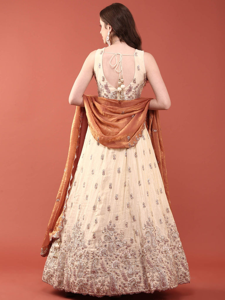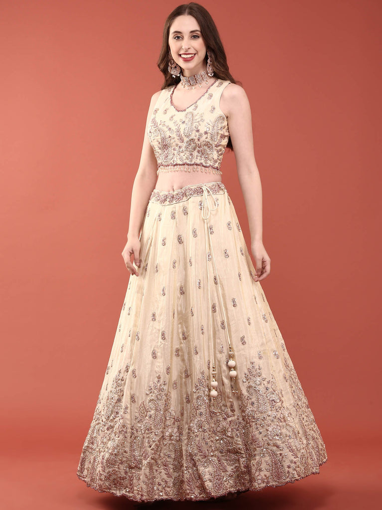 Elevate your ethnic wardrobe with this exquisite cream tissue ghagra set, adorned with intricate hand embroidery that showcases traditional craftsmanship. The delicate tissue fabric drapes beautifully, offering comfort and elegance for weddings, festivals, and special celebrations. Each piece is meticulously embellished with detailed embroidery work, creating a stunning visual impact. Perfect for those who appreciate timeless Indian fashion with a contemporary touch, this set combines heritage artistry with refined sophistication. Make a graceful statement at your next occasion.