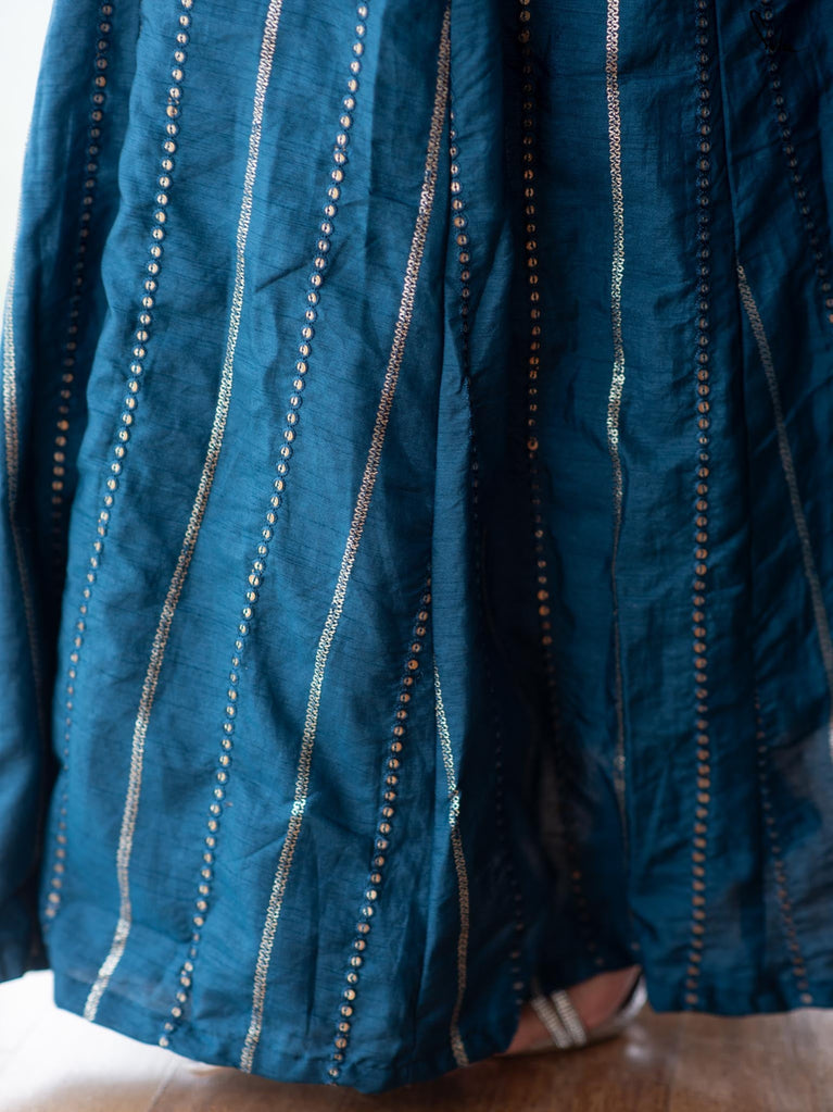 Uncover your hidden glam with the 'Damini Rekha' lehenga, an exquisite machine-embroidered masterpiece, featuring a stunning navy blue hue. This art silk lehenga also features a side zip and knot opening, making your inner style shine through every outing!