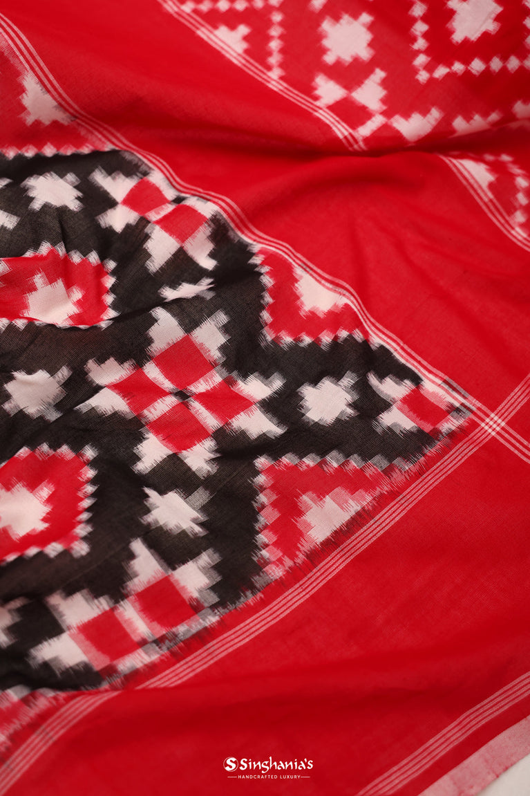 A dark black cotton saree decorated with white and red ikkat pattern in checks weaving all over. The contrast red small border and the pallu feature white floral-geometrical pattern on solid colour, accentuating the whole look.