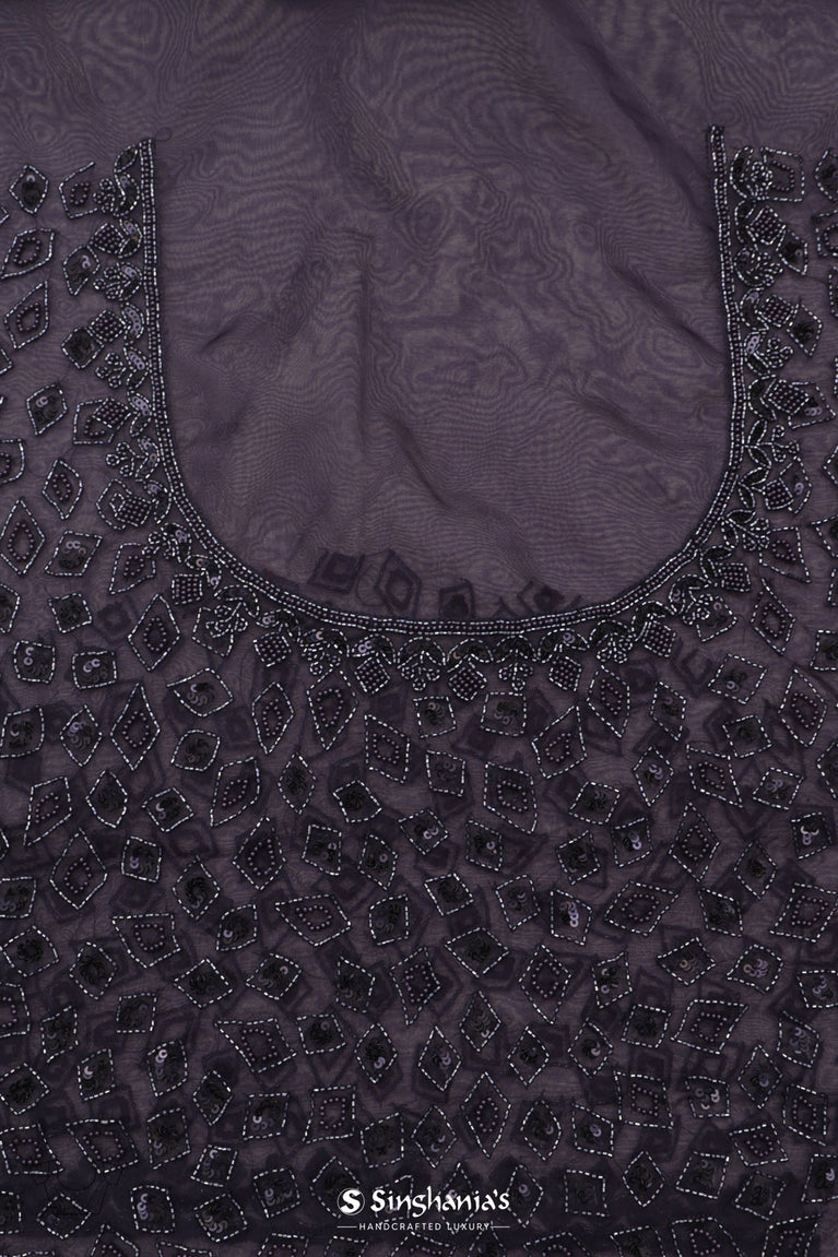 This rich georgette saree in dark navy blue colour has geometrical embroidery all over the saree with intricately embroidered border. It's a great choice for dressing up for a wedding or even for a festive occasion.