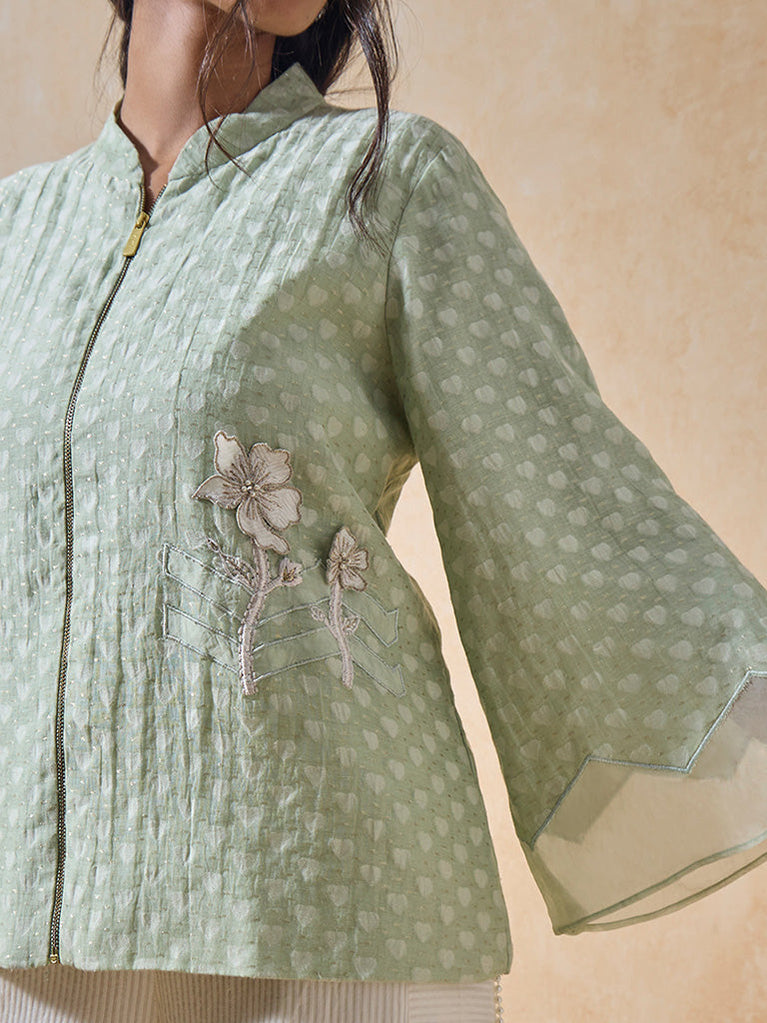 Elevate your layering edit with this green jacket, designed in a textured crinkled fabric with a faint patterned base. Styled with a high band collar and a central zip closure, it is embellished with delicate embroidered floral appliqués for a refined touch. The three-quarter sleeves finish with sheer organza cuffs that add fluidity and charm.