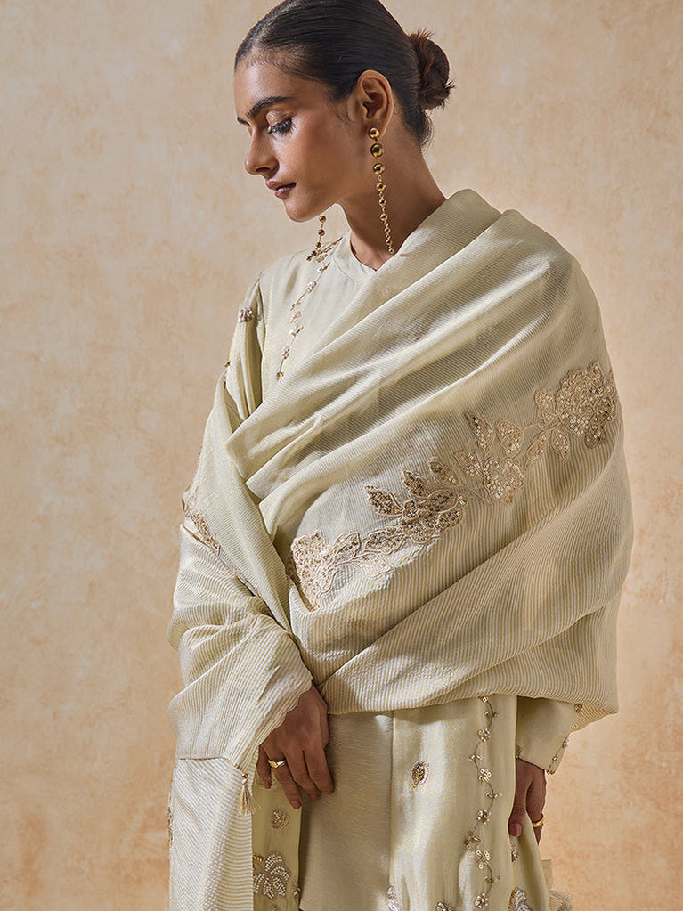 A soft, lightweight dupatta designed to add just the right amount of shimmer and movement to your festive wardrobe. The mustard base carries fine woven vertical stripes that create a gentle sheen, complemented by scattered floral embroidery for a delicate touch. A woven border frames the edges, while the beaded fringe along the sides brings a statement finish that instantly lifts any ethnic ensemble.