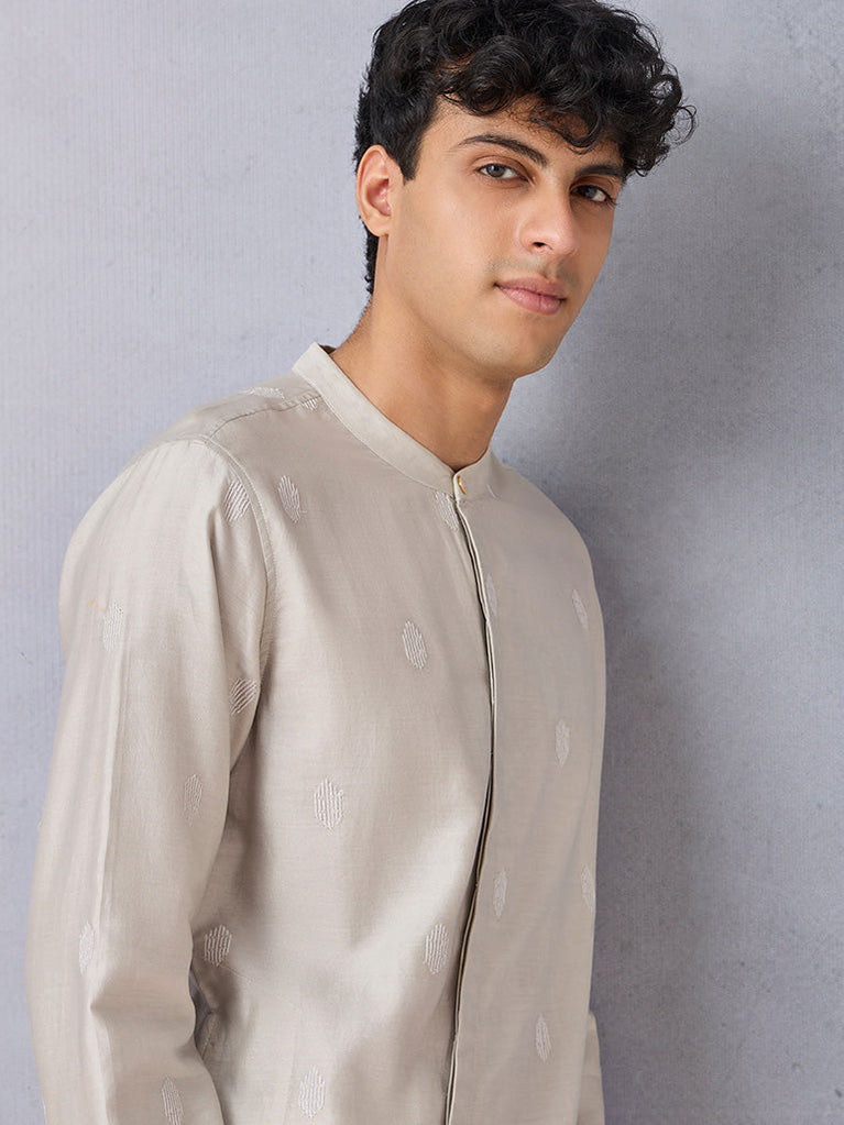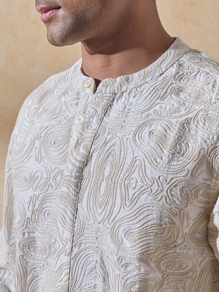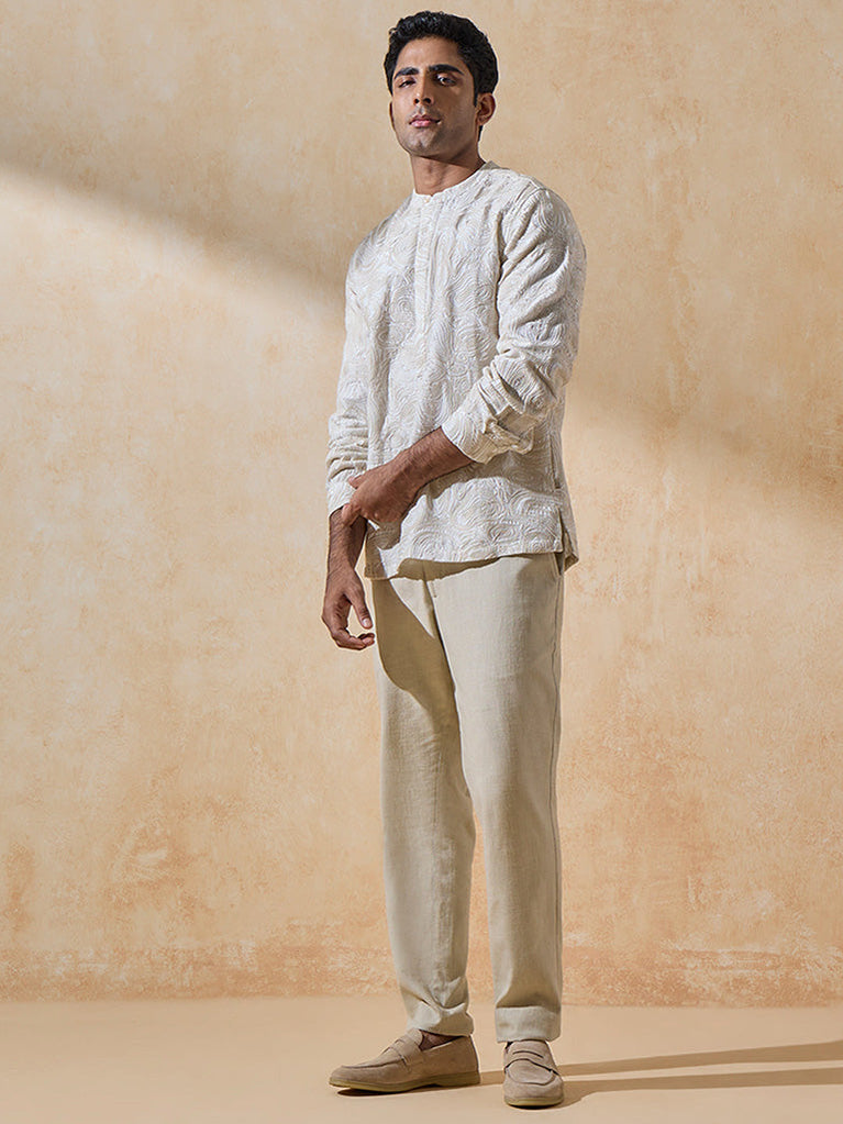 This ivory kurta brings an instant sense of occasion, making it an effortless choice for every festive moment. The soft-sheen fabric catches the light with quiet sophistication, while tonal embroidery lends depth without overwhelming the silhouette. A refined band neck and clean concealed placket sharpen the look, complemented by full sleeves that add a tailored touch. Cut in a straight, easy drape, it pairs smoothly with tapered pants.