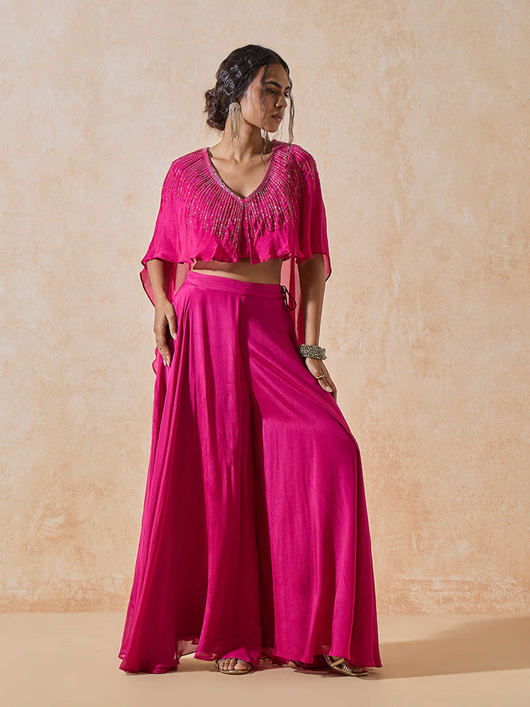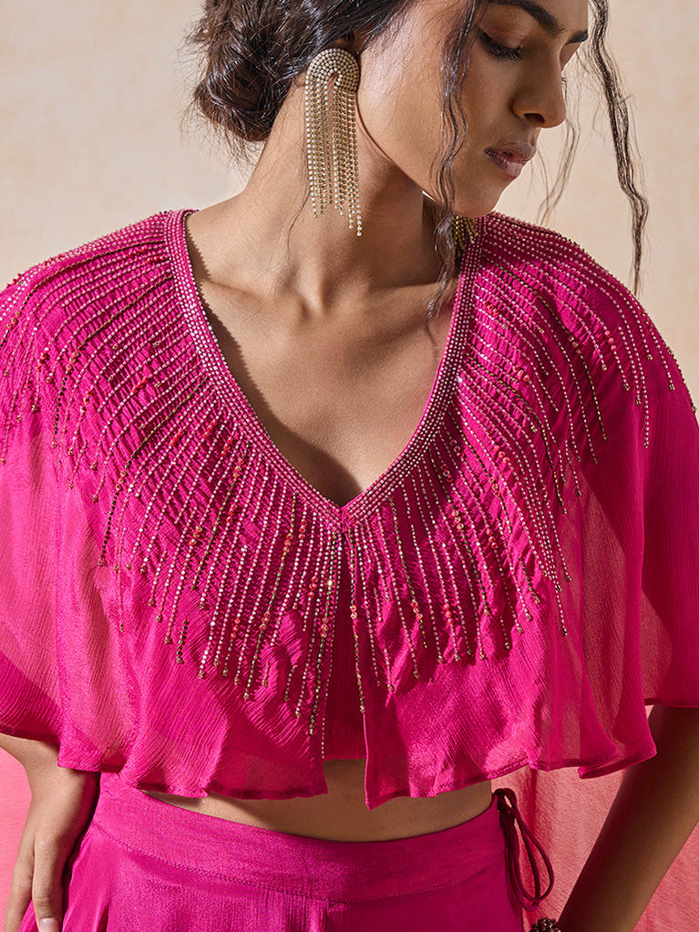 This cropped top brings a fresh twist to traditional wear with its vibrant pink hue and asymmetrical flowy sleeves that offer breezy movement. The V-neckline is beautifully accented with intricate embroidery, adding a touch of artisanal charm. Perfect for pairing with high-waisted skirts or trousers, it’s a versatile piece that blends elegance with ease.