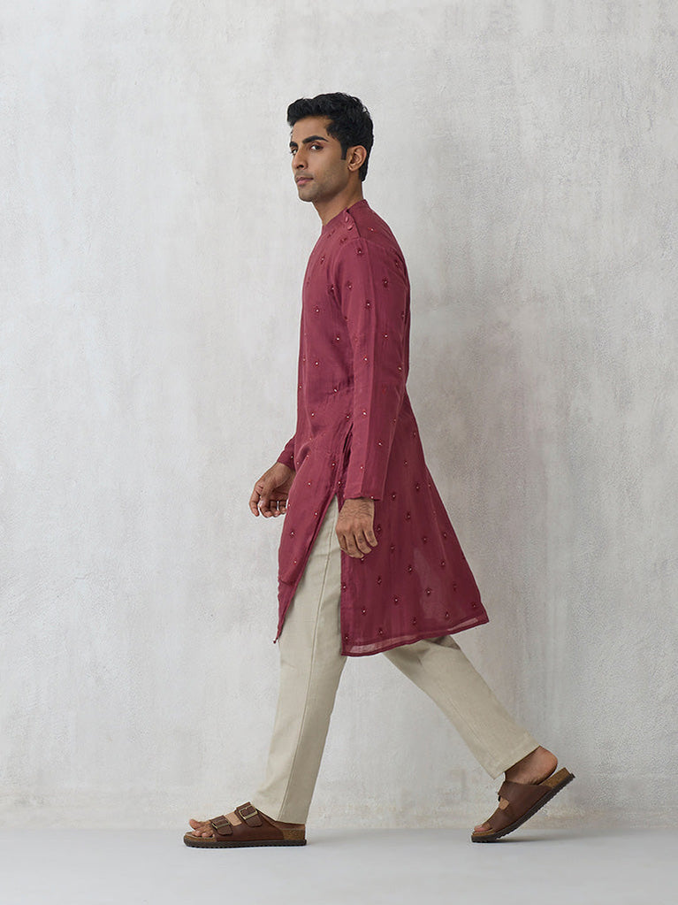 Subtle yet festive, this maroon kurta from Samoh is adorned with delicate embroidered badla motifs. A rounded neckline and long sleeves keep it timeless, making it a versatile option for both celebratory gatherings and everyday sophistication.