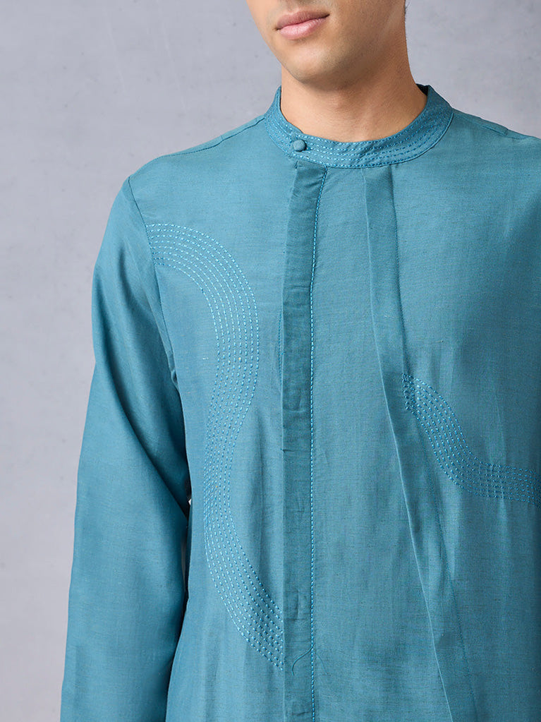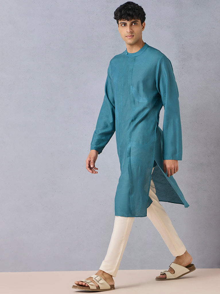 This blue kurta brings a quiet vibrance that feels right at home in every festive moment. Designed with a clean mandarin collar and full sleeves, it leans into a minimal silhouette while the tonal running-stitch embroidery adds texture without overwhelming the eye. Spun from a lightweight fabric that drapes well, it pairs naturally with churidars or tapered pants.
