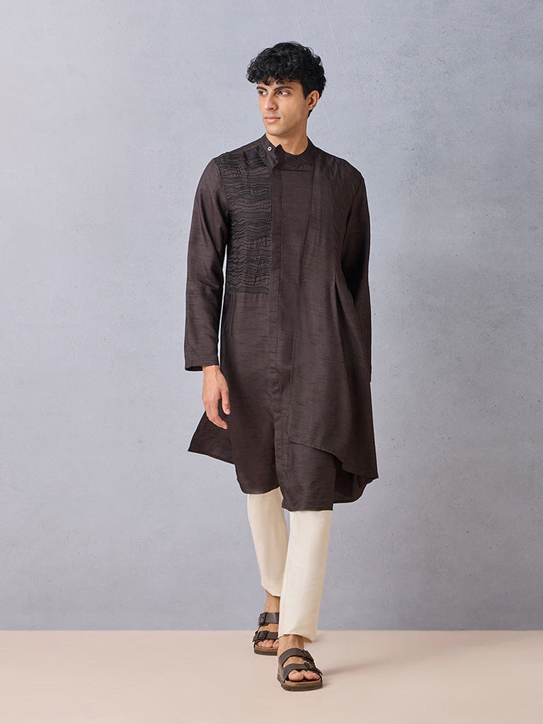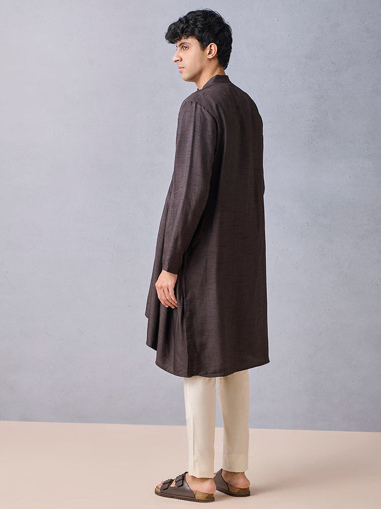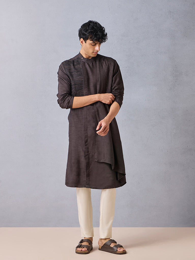 Designed to anchor your festive repertoire with ease, this dark brown kurta offers a refined take on celebratory dressing. Fashioned with a Mandarin collar and full sleeves, the silhouette stays clean while the asymmetric, ruffled drape adds movement and character. The left panel features tonal embroidery that catches light without overpowering the garment. A concealed placket keeps the front polished, and the fluid fabric ensures it falls naturally with every step.