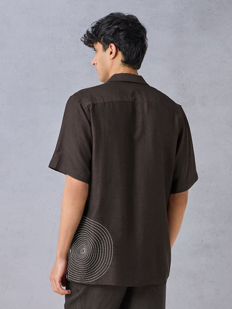 Crafted from a lightweight fabric, this short-sleeve shirt drapes gently and feels cool against the skin. A relaxed camp collar adds an easygoing note, while the cross-over front detail gives the silhouette a subtly elevated edge. Embroidered concentric motifs at the hem and chest introduce a considered detail. Finished with a clean button front and a single chest pocket, it slips seamlessly into weekend plans, holidays, or everyday dressing with equal ease.