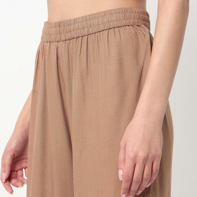 Infuse elegance into your occasion wear assortment with this ethnic set. The boat neck top is cut with an Asymmetrical design adorned with tassels and detailed with delicate floral embroidered work at the front. It's accompanied by a pair of matching wide-leg palazzos covered with bird and rose patterns, adorned with intricate floral embroidered designs at the hemline for added femininity.