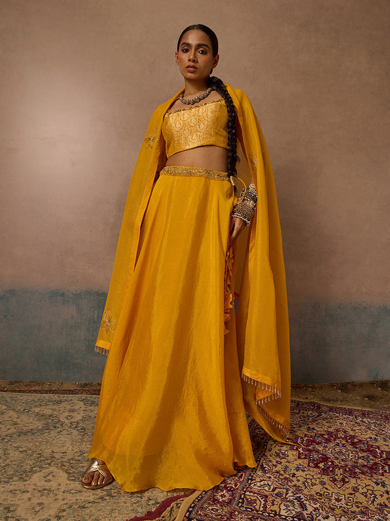A festive skirt designed with soft structure and understated shine. Crafted in a luxurious fabric, it features a zari-embroidered waistband with tassel-tipped drawstrings that add charm and adjustability. The maxi silhouette falls gently with each step, and side pockets offer an unexpected, practical touch.