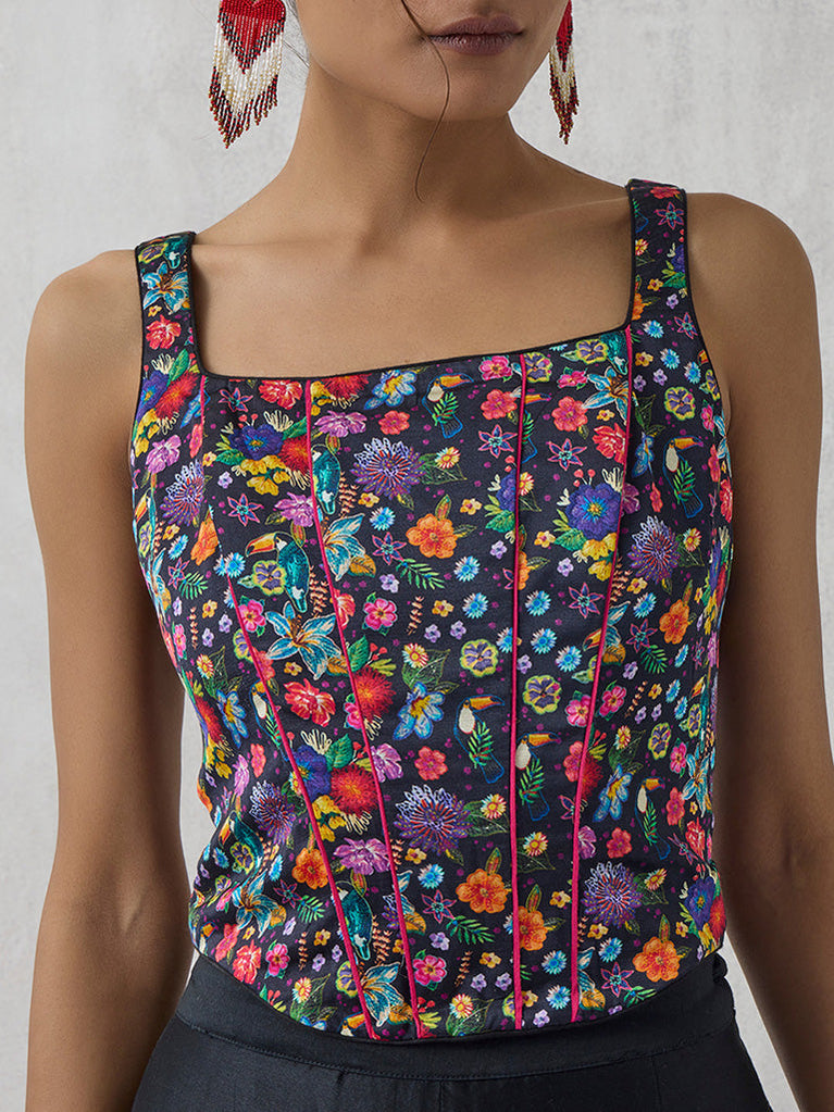 Designed for days that call for effortless colour and statement charm, this floral printed top strikes the perfect festive note. The square neck and sleeveless cut lend a flattering edge, while contrast piping beautifully frames the silhouette. Whether styled with flowing skirts for traditional gatherings or wide-leg trousers for a modern flair, it’s a versatile piece that balances elegance with ease.