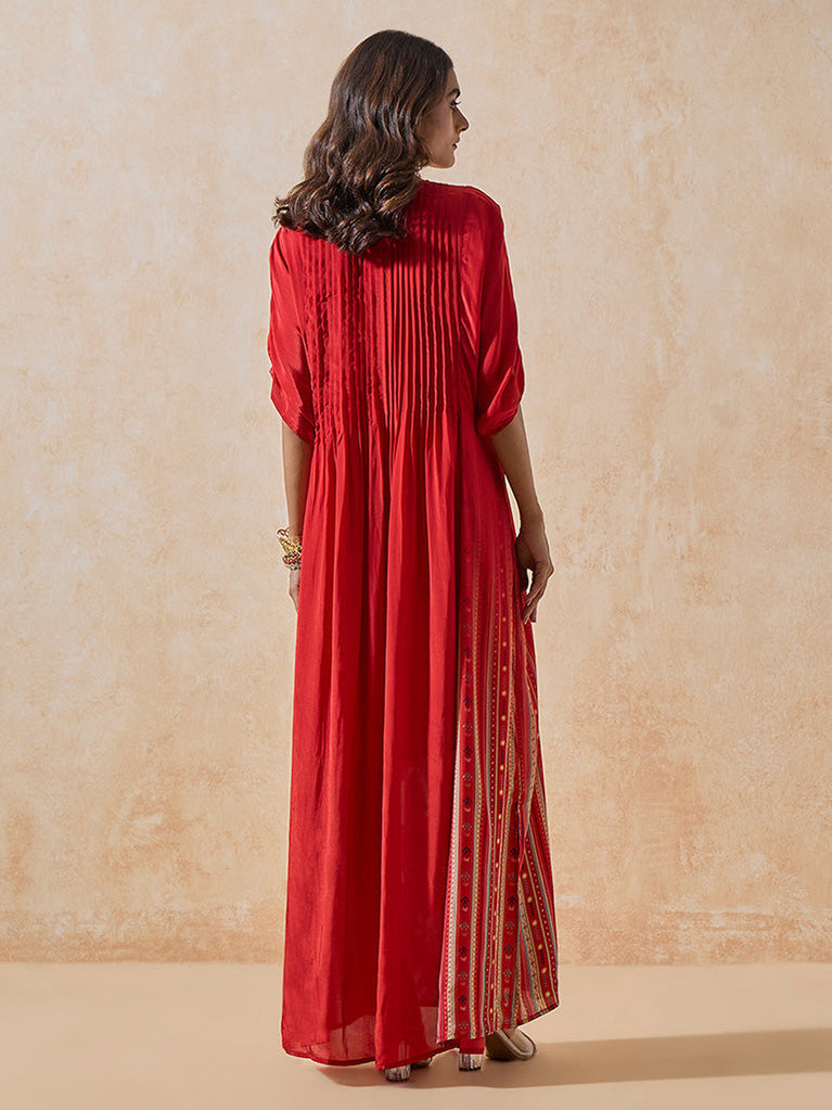For evenings that demand both comfort and allure, this red kaftan with inner is the perfect match. The pintucked yoke and ruched sleeves lend refinement to its fluid form, while floral patterns and striped inserts create visual depth. An ensemble that transitions seamlessly from daytime festivities to twilight celebrations.