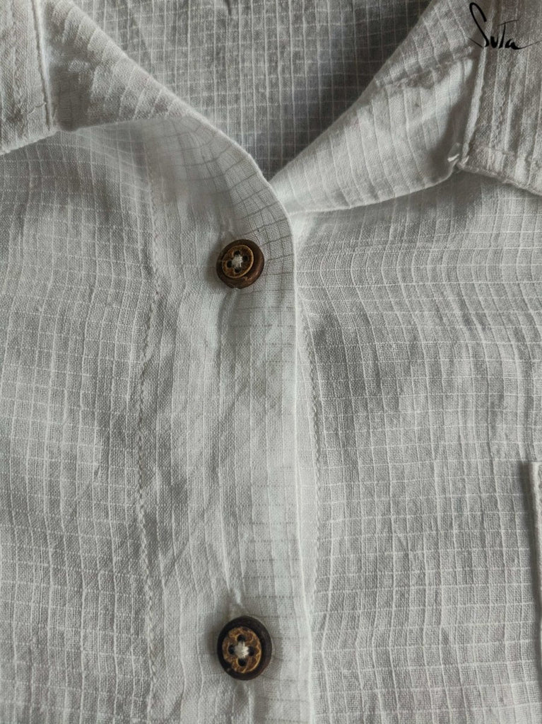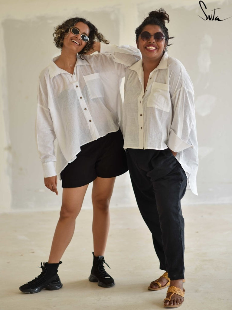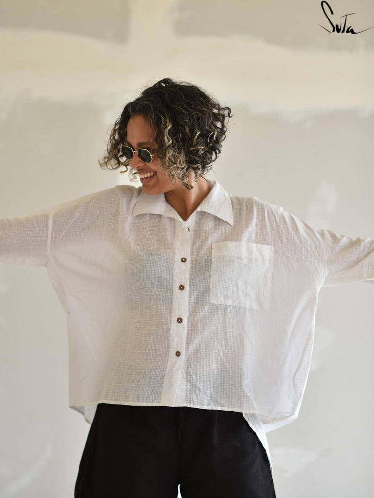 This pristine white handloom cotton shirt thats been designed such that one size flatters all body types (XS to 2XL) will envelop you in a soft, freeing embrace.