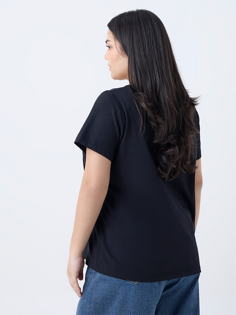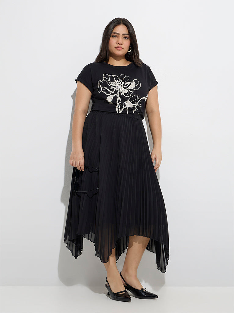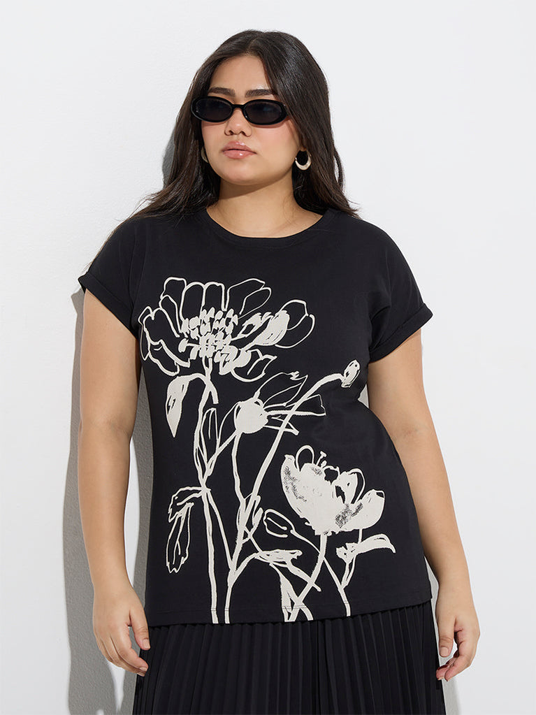 Black tee by Gia accented with foliage motifs that bring a refined, nature-inspired charm. Crafted from pure cotton, it feels soft against the skin while offering a relaxed, curve-friendly fit. Finished with a classic round neck and short sleeves, it is an everyday piece that balances comfort and quiet style with ease.