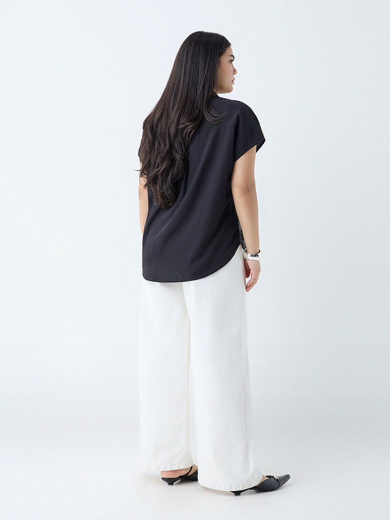 This black blouse from Gia is defined by intricate embroidered lace along the hem, adding a touch of elegance to everyday dressing. Designed with a smart collar and relaxed dolman sleeves, it’s crafted from a breathable fabric for all-day comfort.
