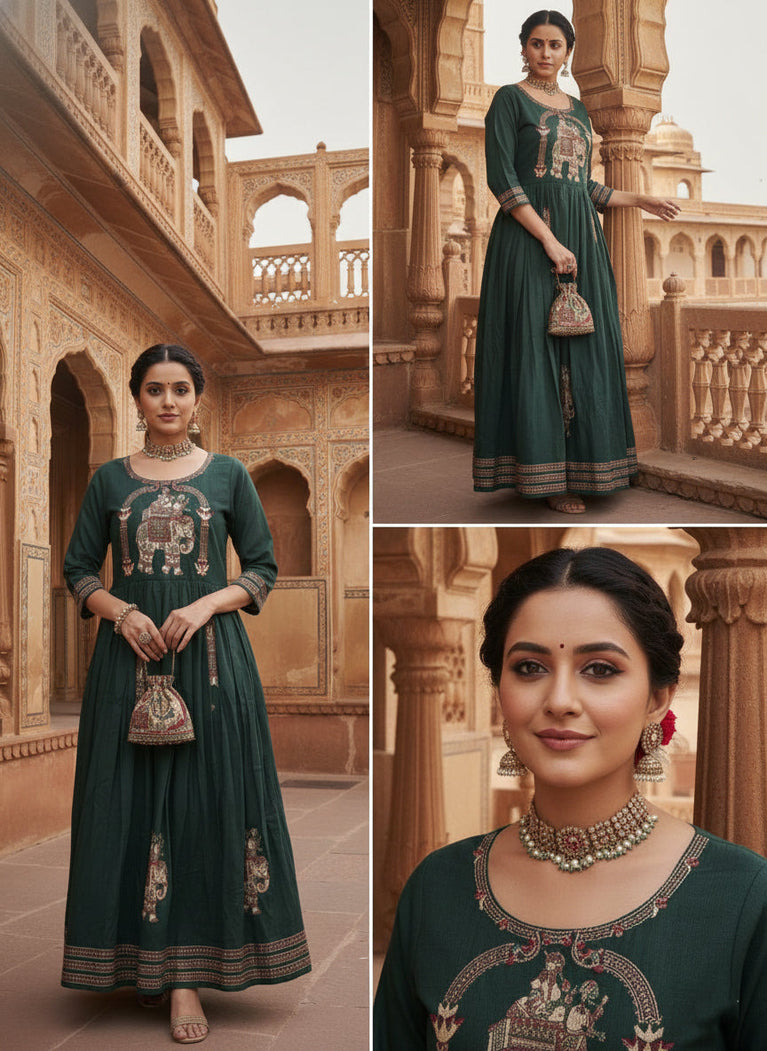 Embrace effortless elegance with this stunning green chinnon printed long dress. Crafted from lightweight chinnon fabric, this piece offers breathable comfort perfect for warm weather occasions. The vibrant green hue paired with intricate prints creates a sophisticated look that transitions beautifully from day to evening wear. The flowing silhouette flatters all body types while the long length adds a touch of grace and refinement. Ideal for festivals, celebrations, or casual gatherings, this dress lets you express your personal style with confidence and poise.